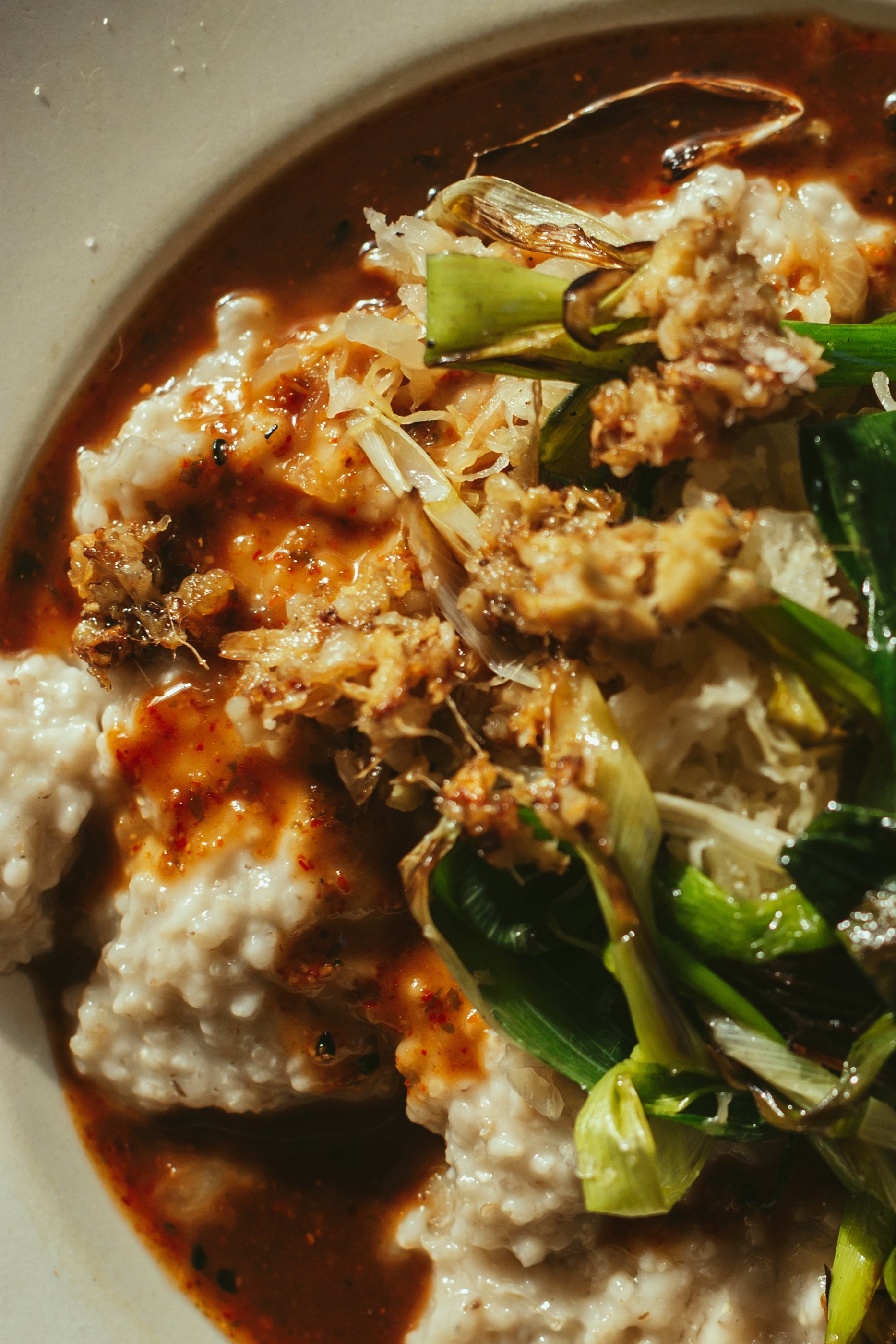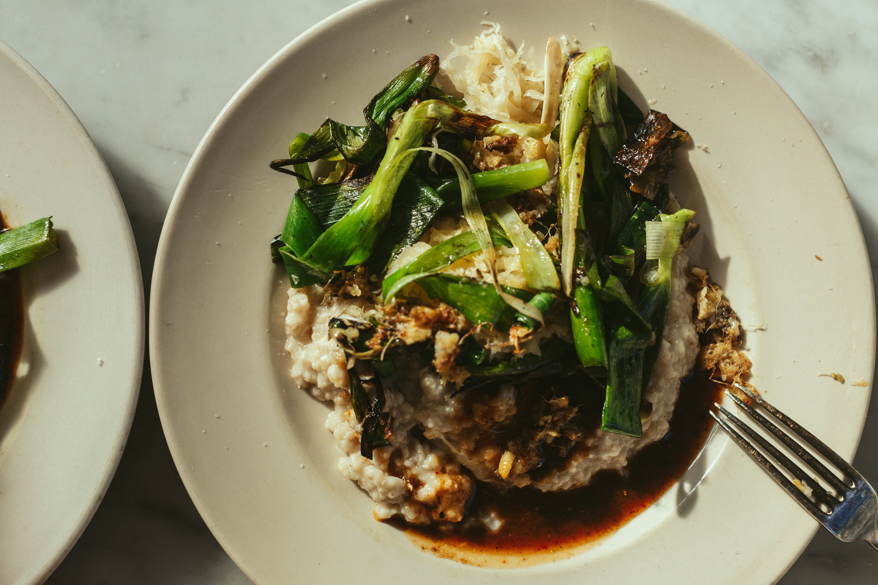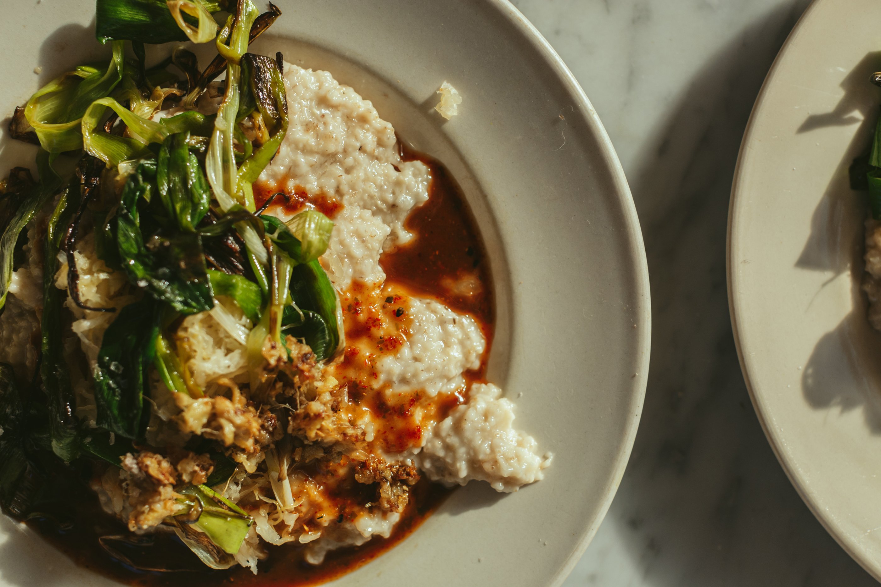 To serve, divide the oatmeal between bowls, and top with spring onions, scrambled tofu and sauerkraut. Drizzle the melted umami butter, and enjoy!