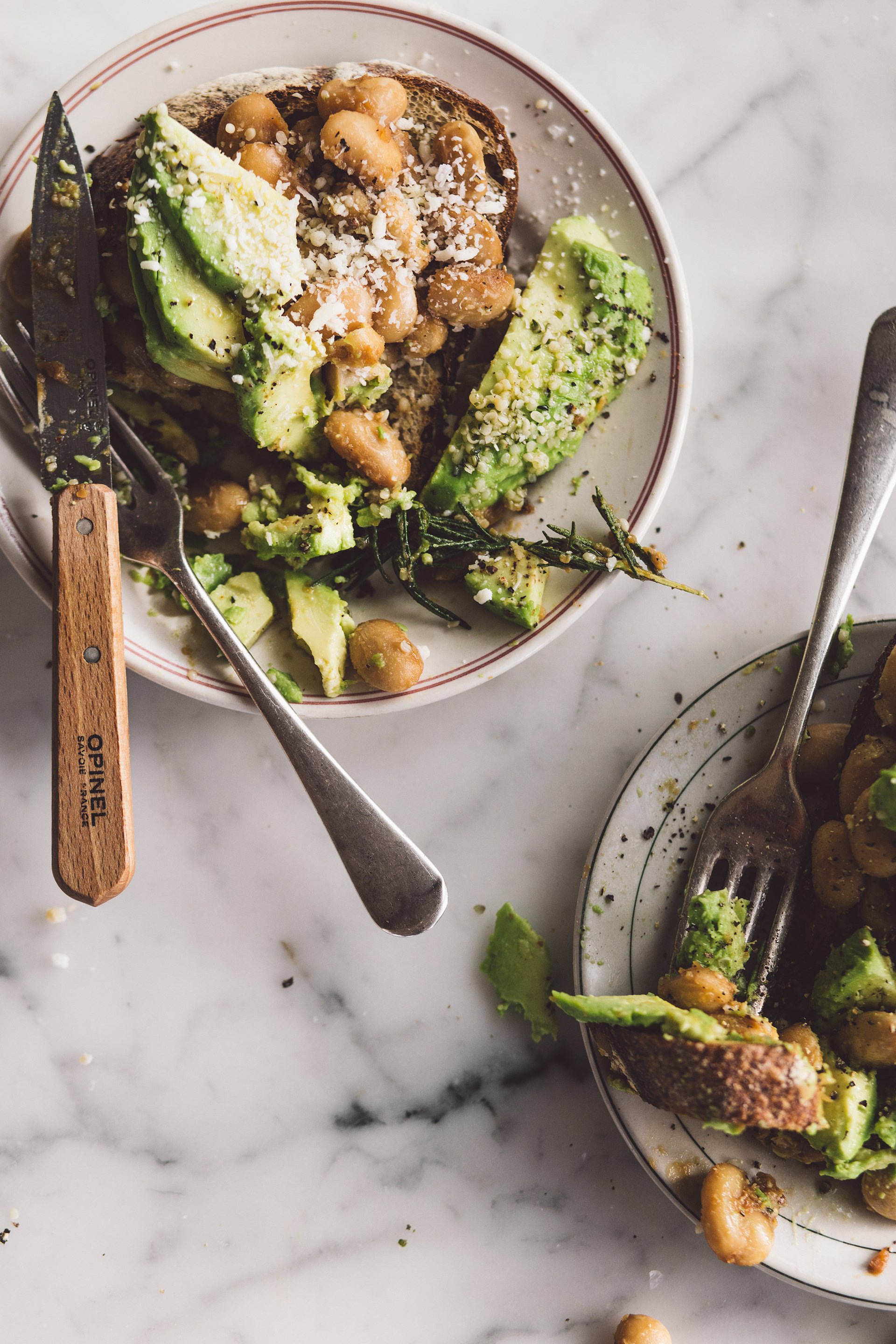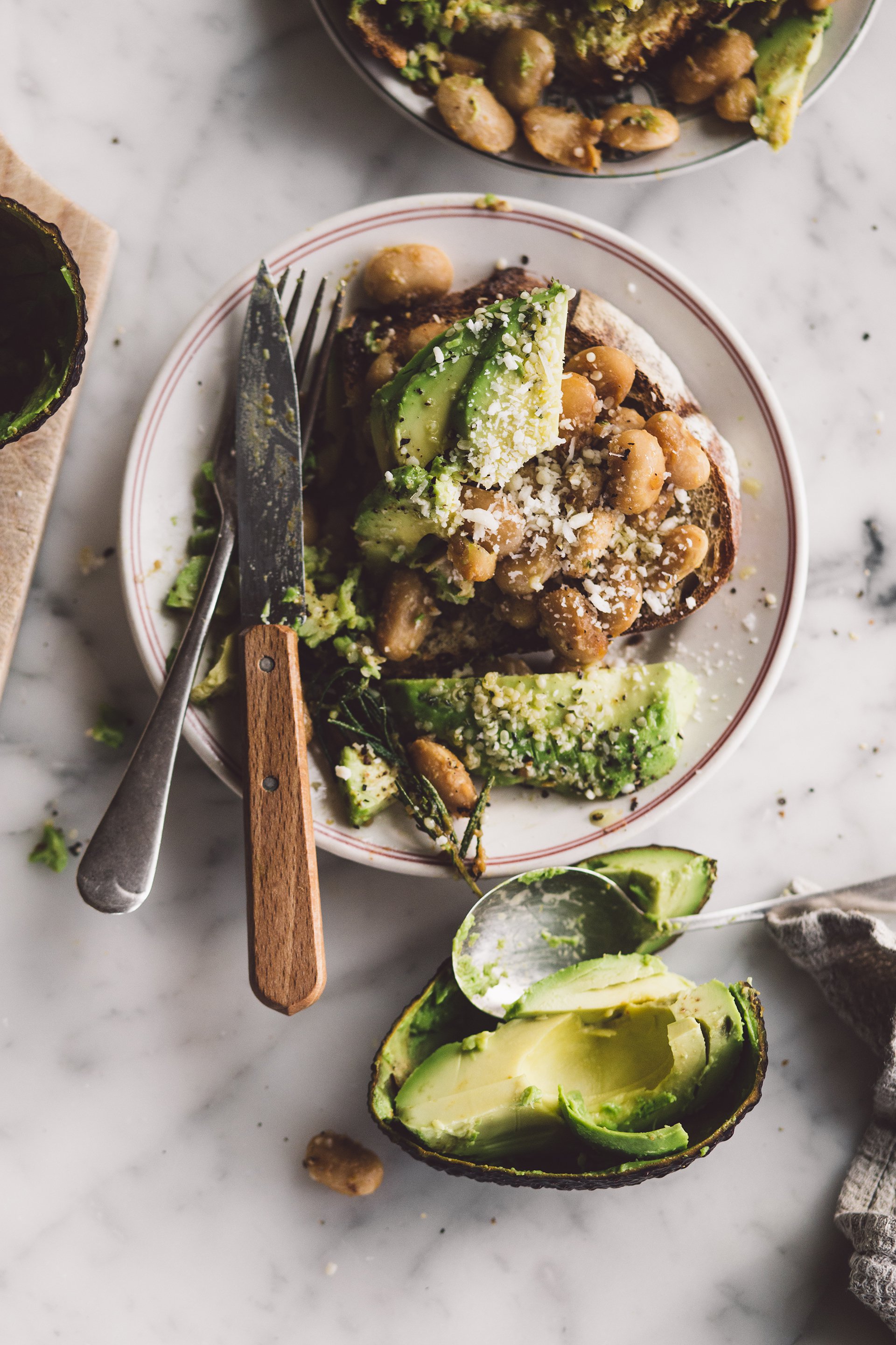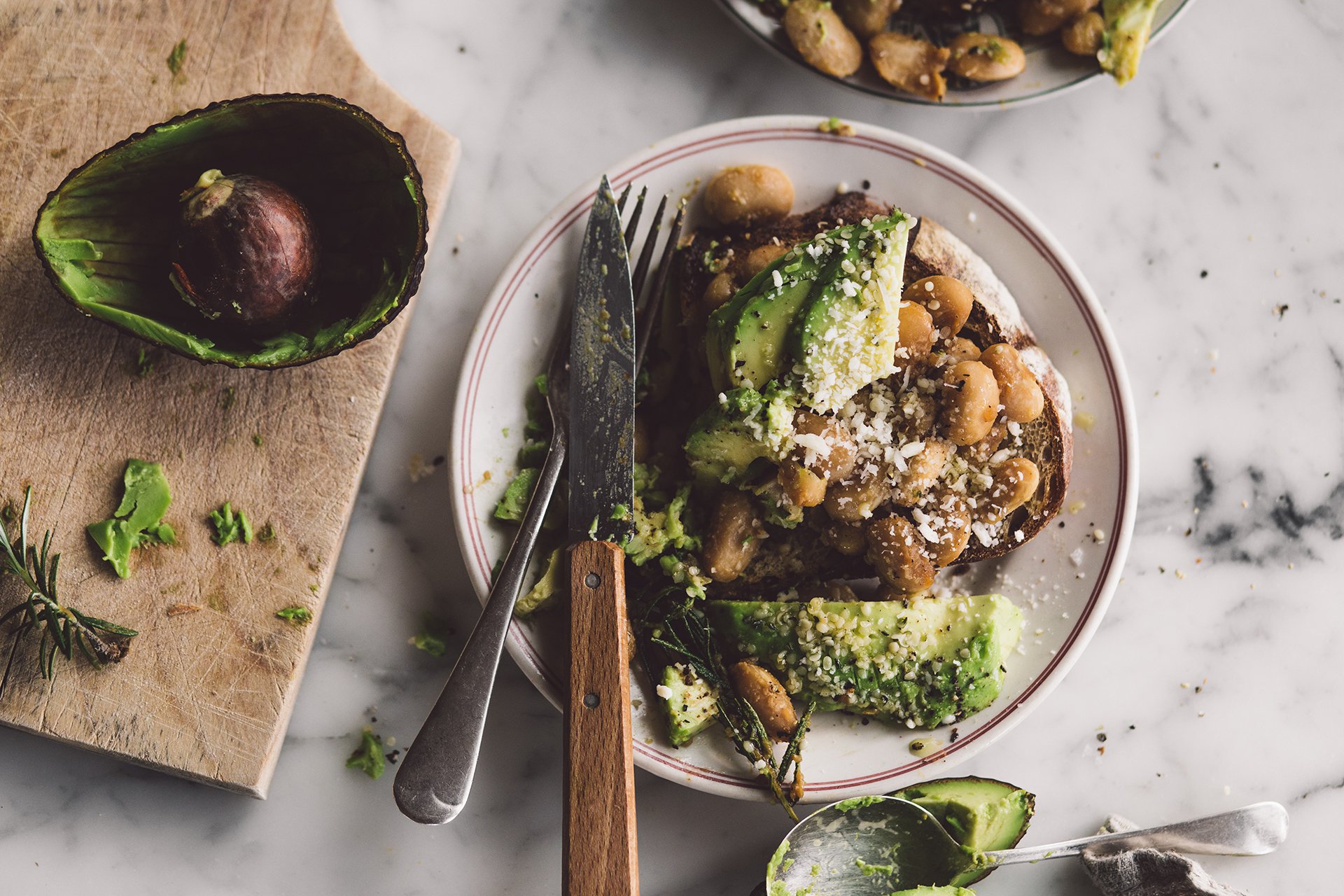 During fermentation, Lactic Acid bacteria produce a wide range of bioactive molecules including organic acids, fatty acids, and bacteriocins. Lactic Acids increase your body’s ability to absorb vitamins and minerals from the sourdough, neutralising phytates in the flour that would otherwise interfere with their absorption. And while bread can be thought of as a high glycemic (GI) food, Lactic Acid bacteria in sourdough actually reduces starch availability and lowers glycemic responses. Research also finds sourdough has higher levels of resistant starch than other bread — your body takes longer to digest these carbohydrates so blood sugars are more stable. It can take 24 hours to make a loaf or even three days to make proper sourdough bread. I love the sourdough loaves from The Dusty Apron. Amandine and I, our entire house orders up weekly. Sourdough bread is something I eat most days. The supermarket does not sell real bread. Look for producers of fermented bread local to you. Here slices of crusty, organic sourdough are topped with herbed miso beans, then you add all your favourite things. Mine are listed below.