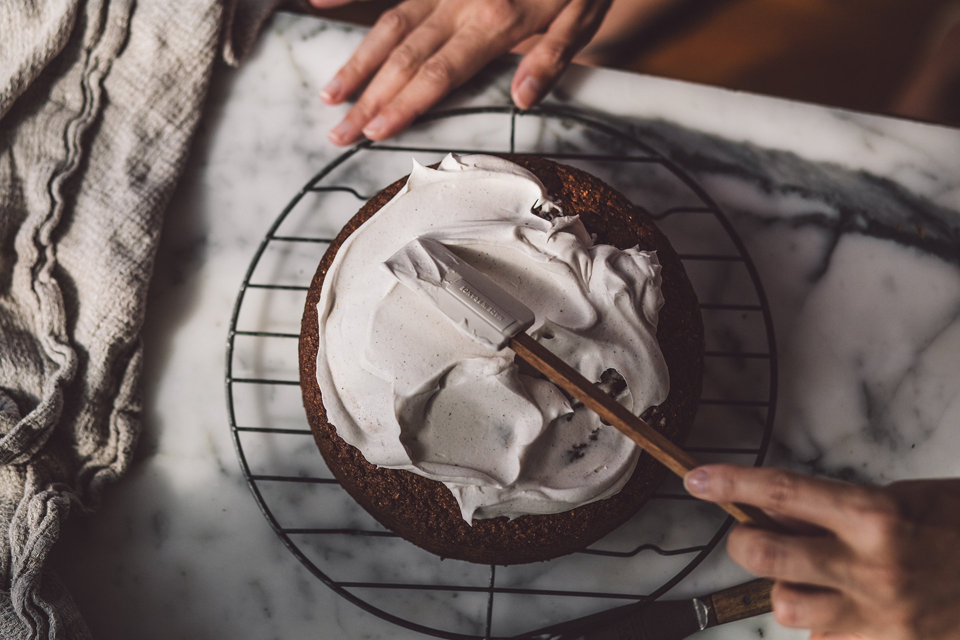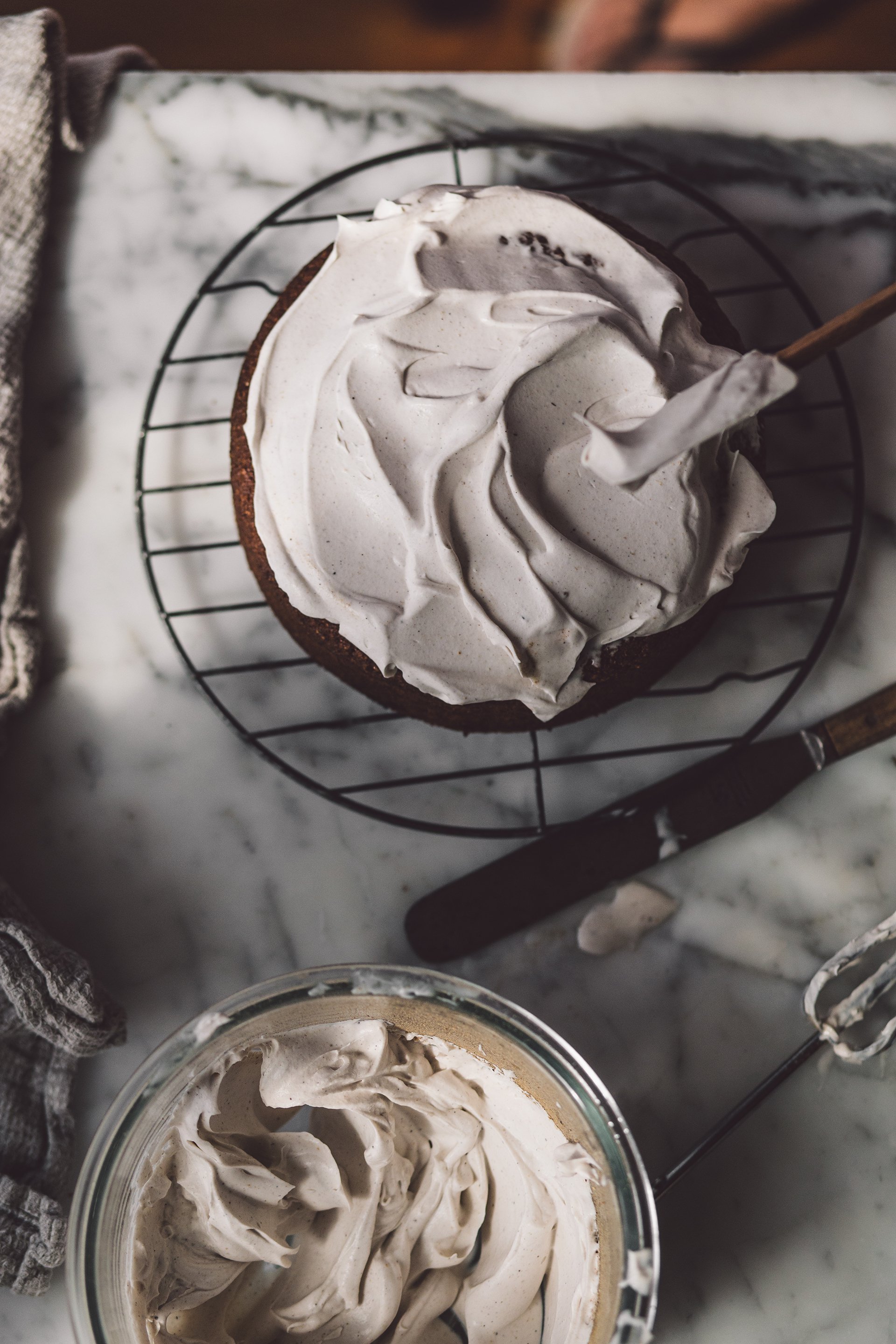 Using a hand mixer, whip the coconut cream with rice malt syrup and chai spice until fluffy and thick. The whipped coconut cream should be stable enough to ice cake or cupcakes with. You can even fill it into a (chilled) pastry bag with piping tip, to frost cupcakes with fancy swirl patterns.