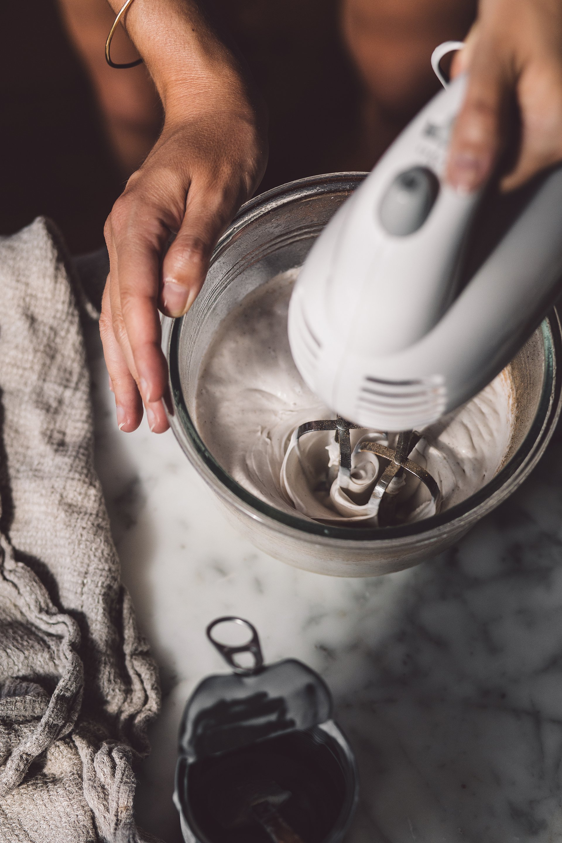 To prepare the coconut frosting, first chill the can of coconut cream overnight, longer if possible. Depending on the brand you use, either you’ll reserve the full fat cream or extra fatty coconut cream, like what we used will remain thick throughout so you can use the entire contents of the can.