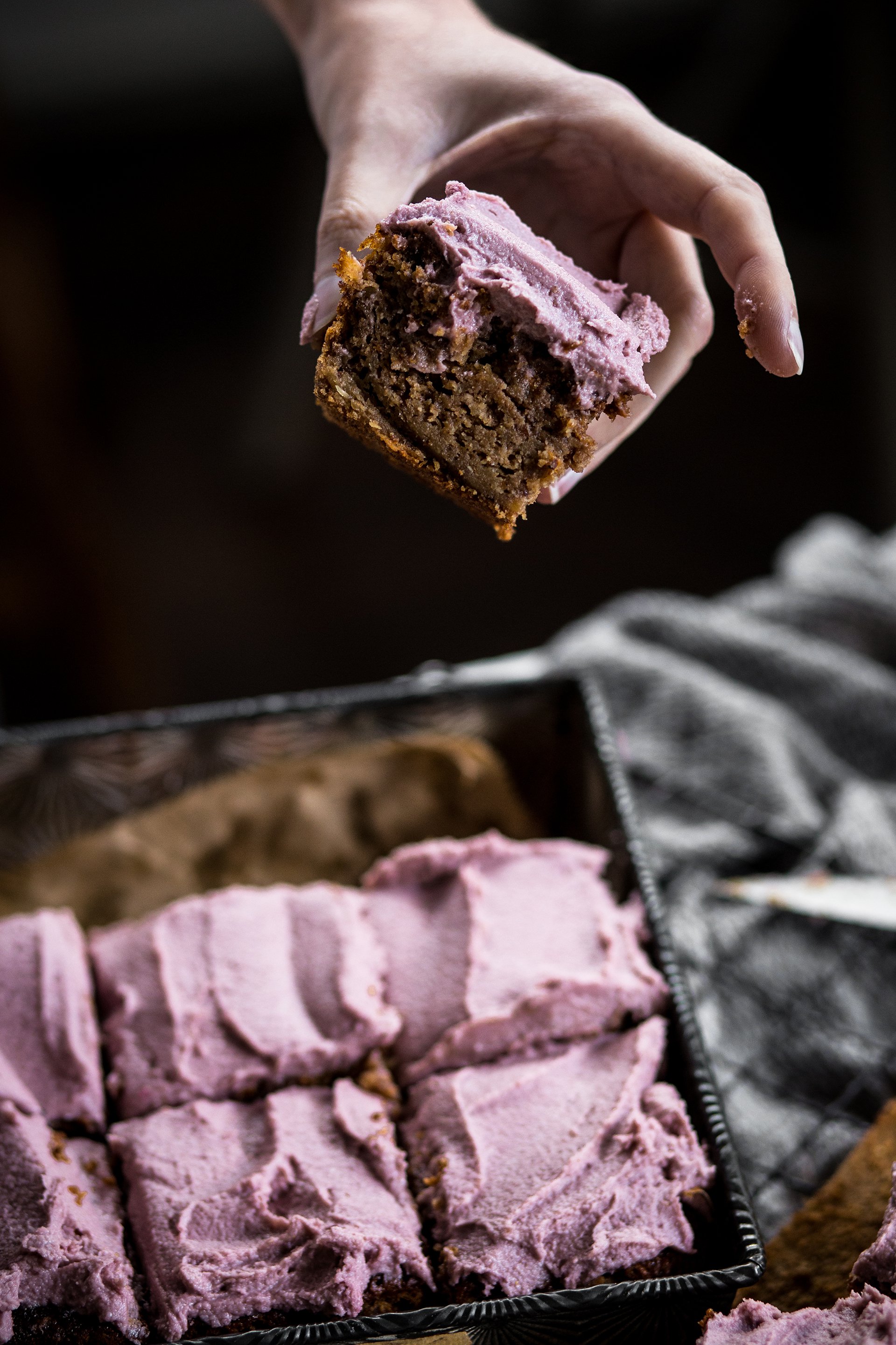 Then the frosting colour. We tone the frosting using two natural food colourings, açaí and beetroot powder. We wanted to reach a light pink shade, so we mixed them both. However, for a pure purple tint, açaí alone will suffice. Same if you want a bright pink, beetroot powder on its own is perfect. Add the colour gradually in small amounts, until you achieve the desired colour. Our choice for these natural food colourings was dictated by their flavours, the beetroot sweetness balancing well the bitterness of açaí. Note, best to savour this frosting on the day; if you happen to have leftovers, it will crack after a day of keeping. Not a problem for taste, though.