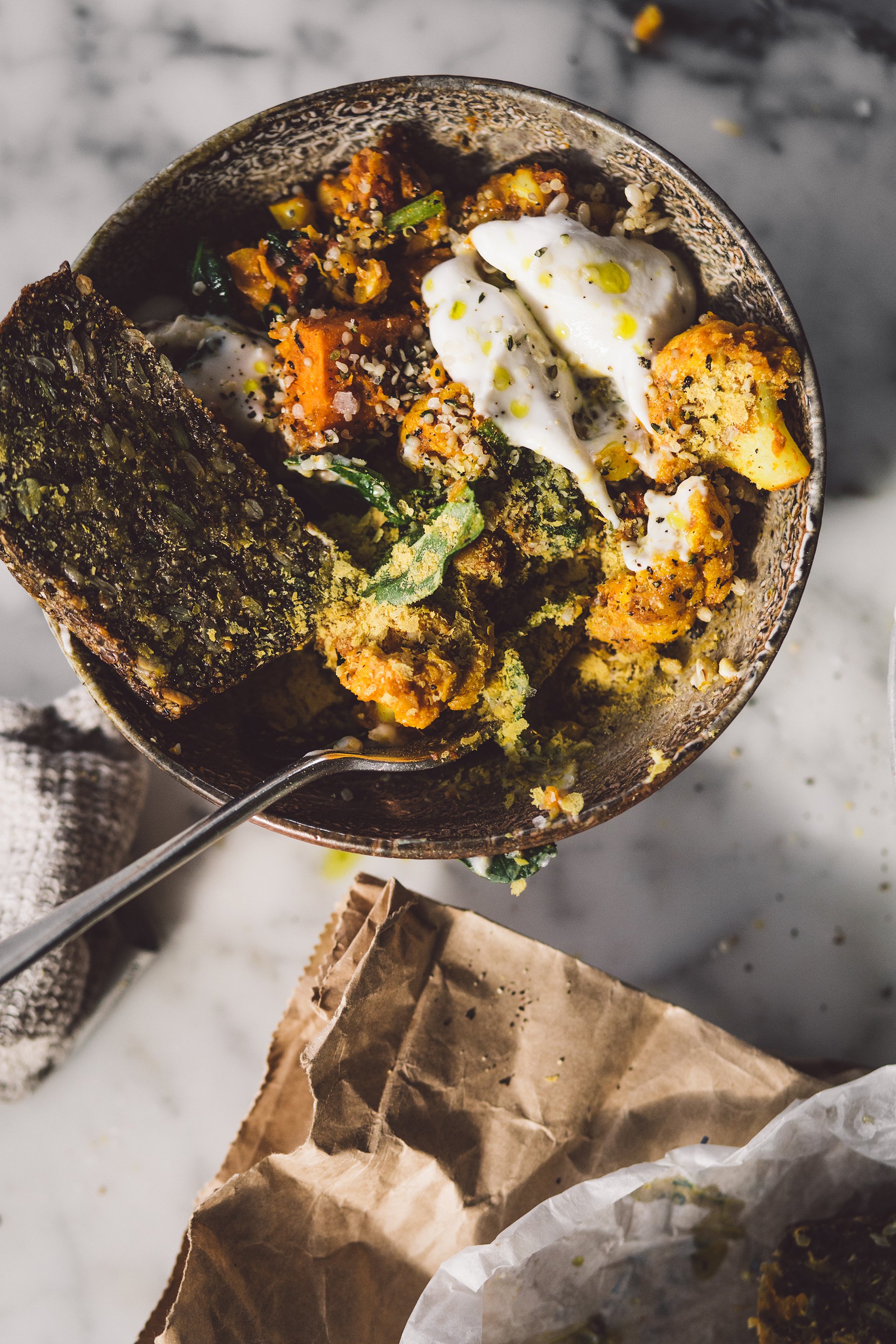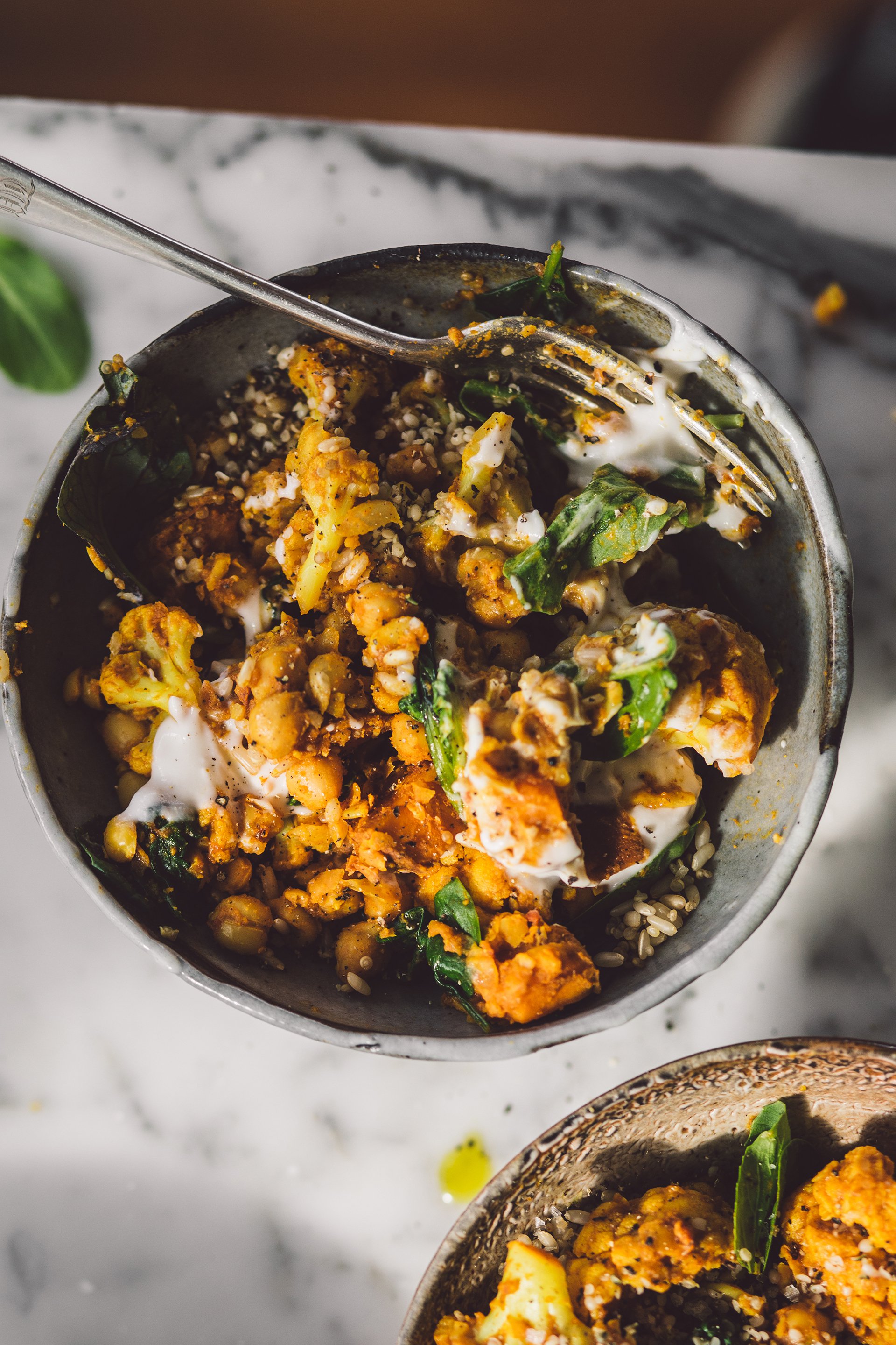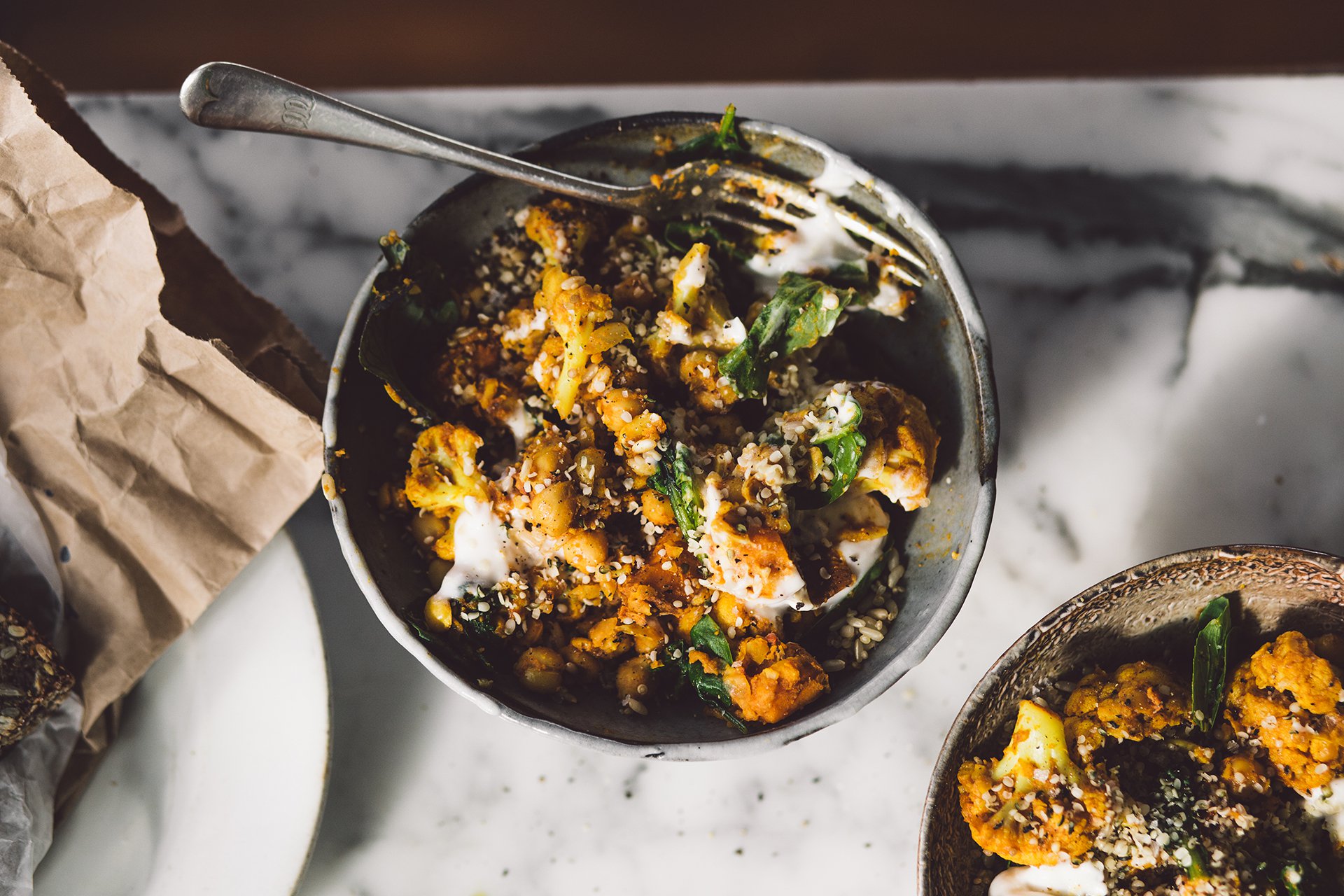 Divide quinoa amongst bowls and top with the kumara cauliflower curry and serve immediately.