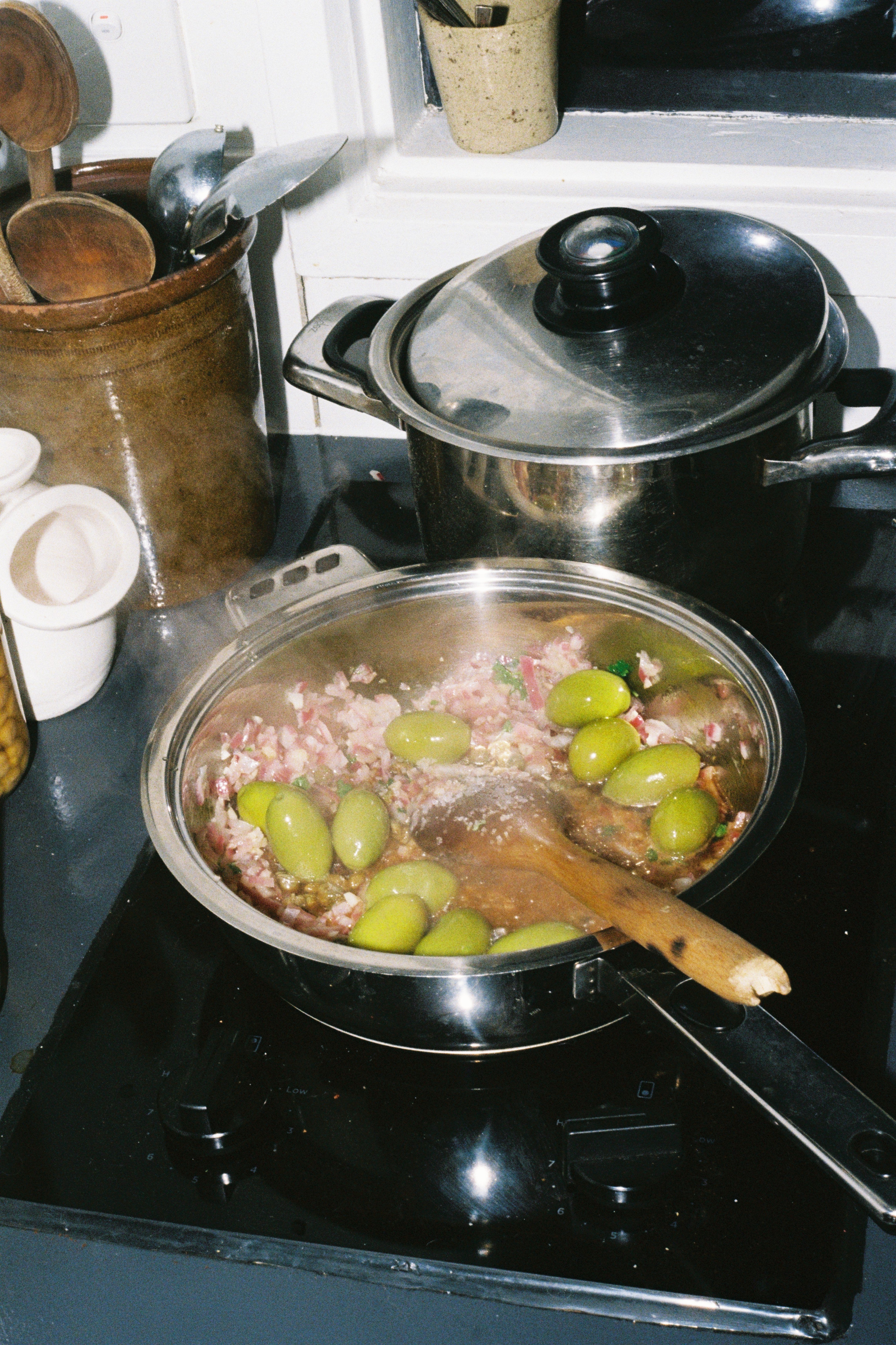Add the lemon juice, vinegar and olives with capers. Reduce the heat to low and simmer for 5 minutes. Pour the chickpeas with their stock, give it a good stir and let it simmer again for another 5 to 10 minutes until the mixture thickens. Pour in the baked aubergines and top with parsley, stirring to combine.