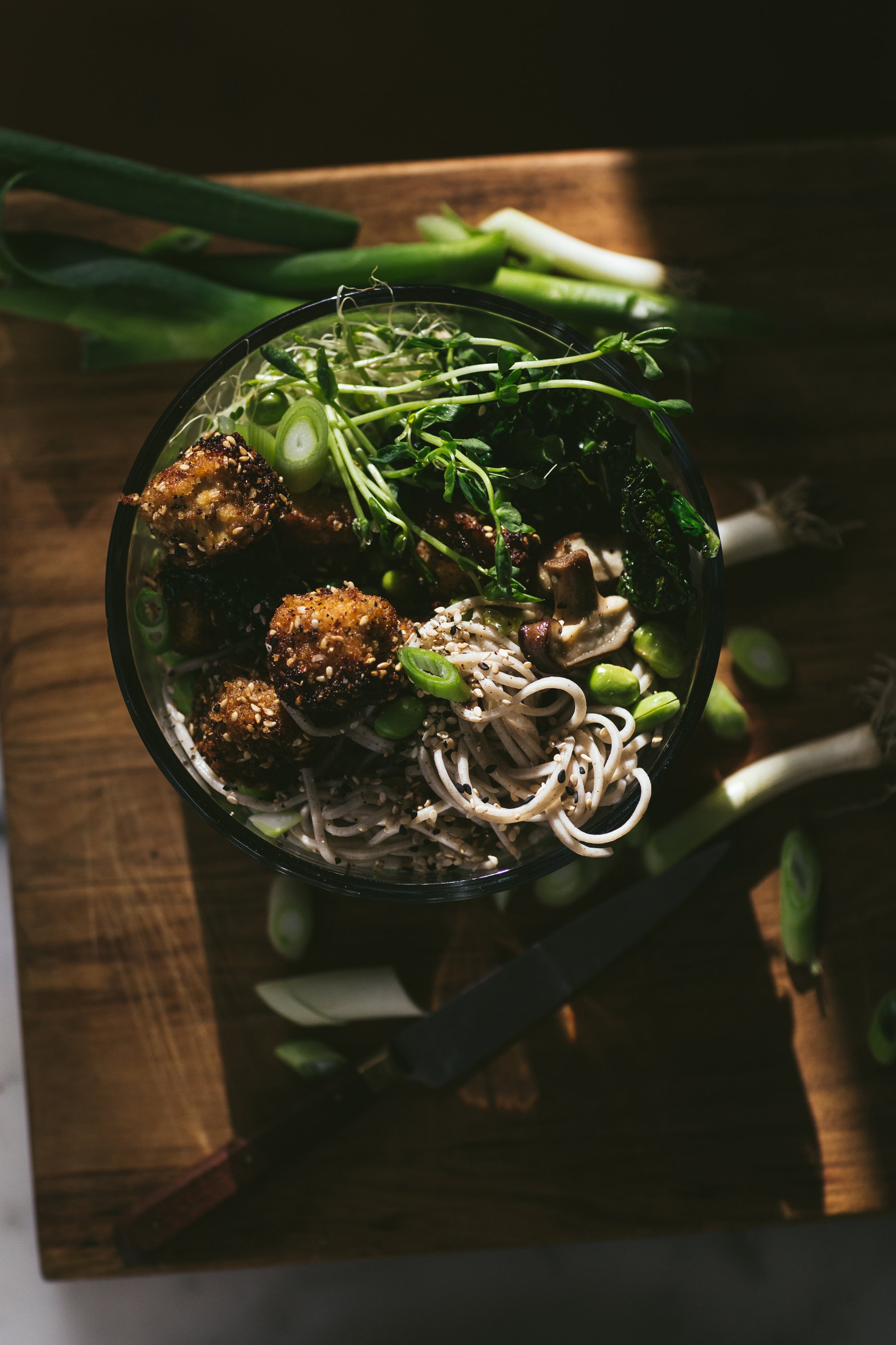 Place the tofu on a plate. In the same frypan, add the soaked mushrooms, cook until softened. Add the greens and edamame, and saute for a few minutes until fragrant. Add the noodles, tossing for another minute and set aside.