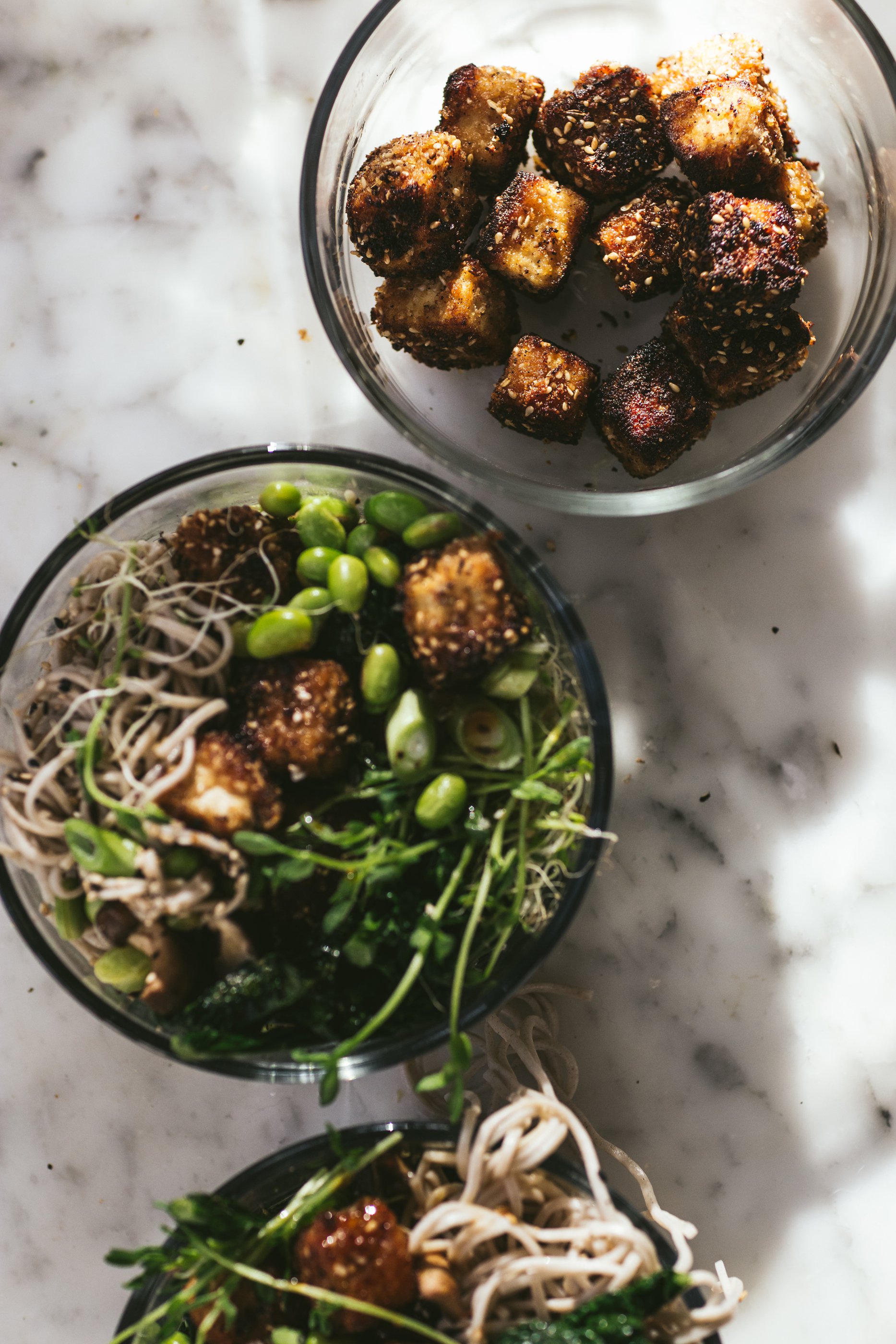 To serve, divide the noodles, greens, mushrooms and edamame between bowls. Add the Karaage tofu and top with spring onion and sesame seeds. Drizzle over the teriyaki sauce. Serve immediately.