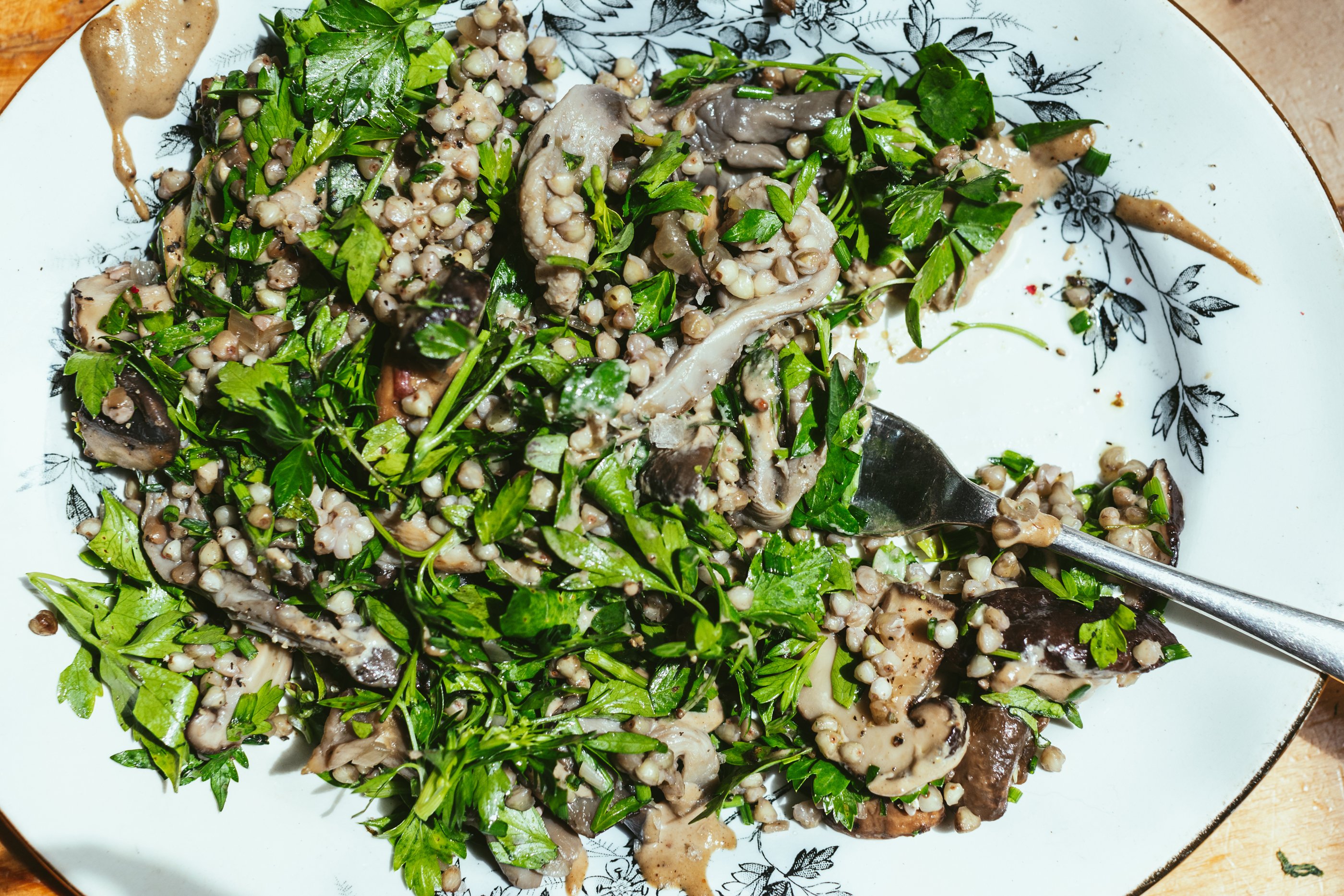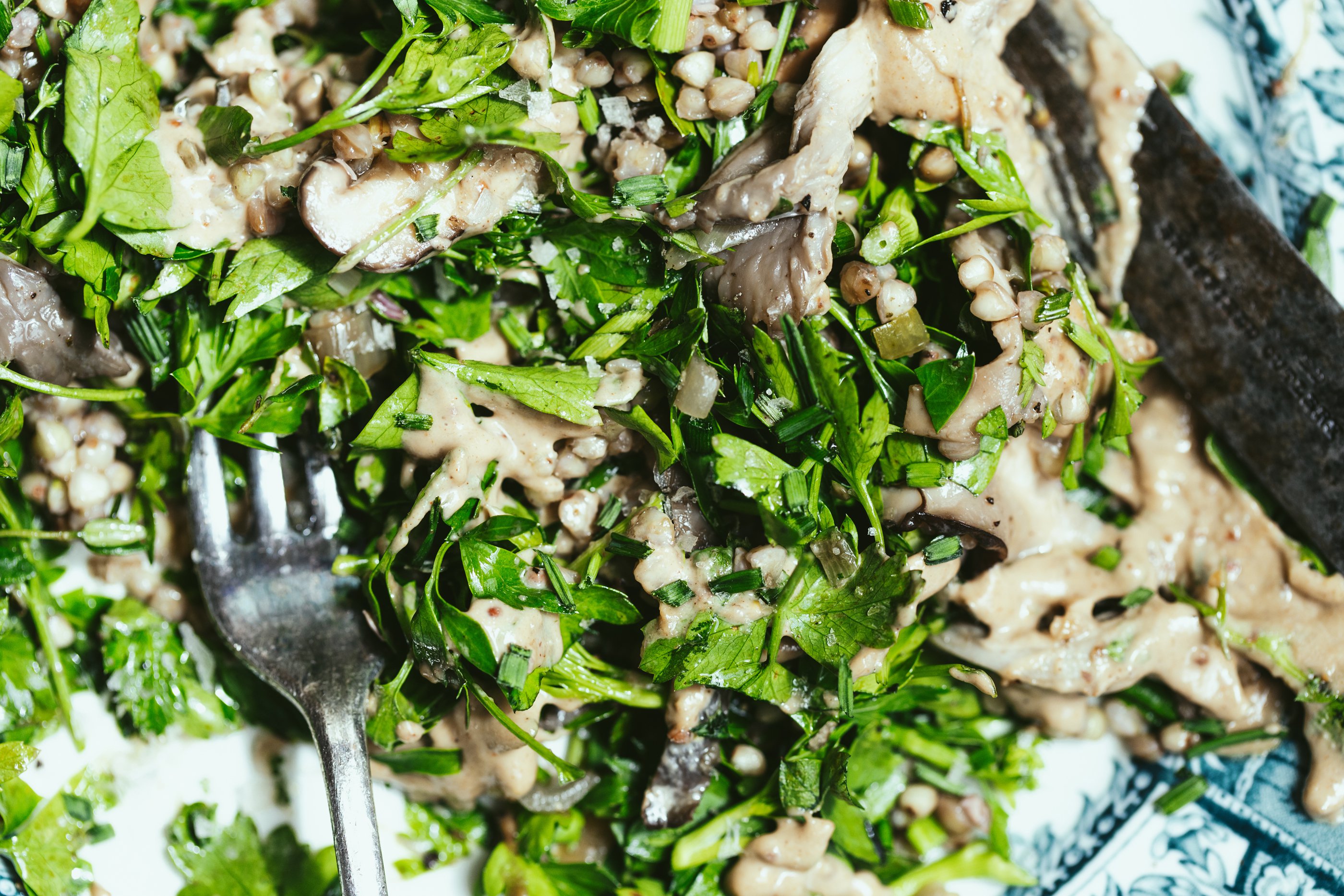 To assemble, plate the tahini mustard dressing first, then layer on top the buckwheat salad. Garnish with extra herbs and extra toasted seeds. Serve immediately.