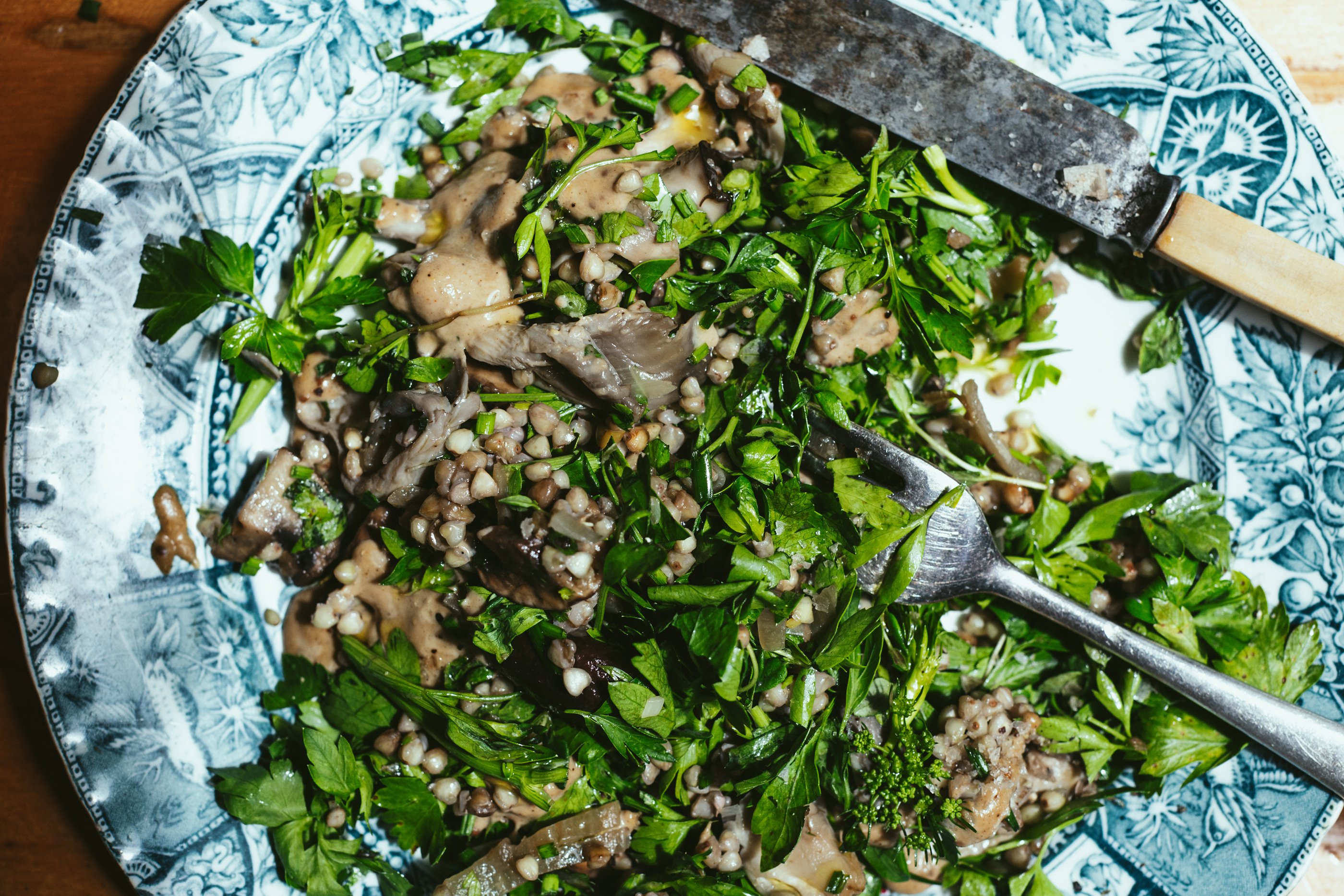 Reduce heat to medium, add the thyme and garlic. Remove from heat, squeeze over the lemon juice and fold through the herbs. Transfer the mushrooms to the buckwheat, and fold through to combine.