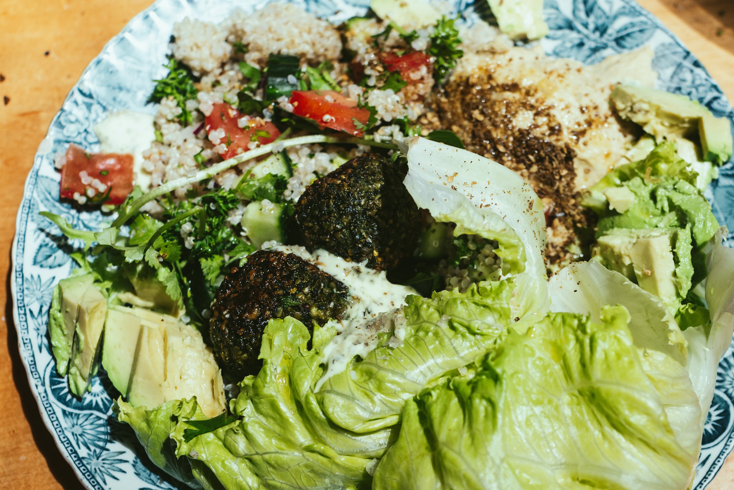Place washed lettuce onto a plate. Place spoonfuls of tabbouleh into your lettuce cups. Add falafels and a generous tablespoon of hummus. Garnish with sliced avocado. Enjoy.