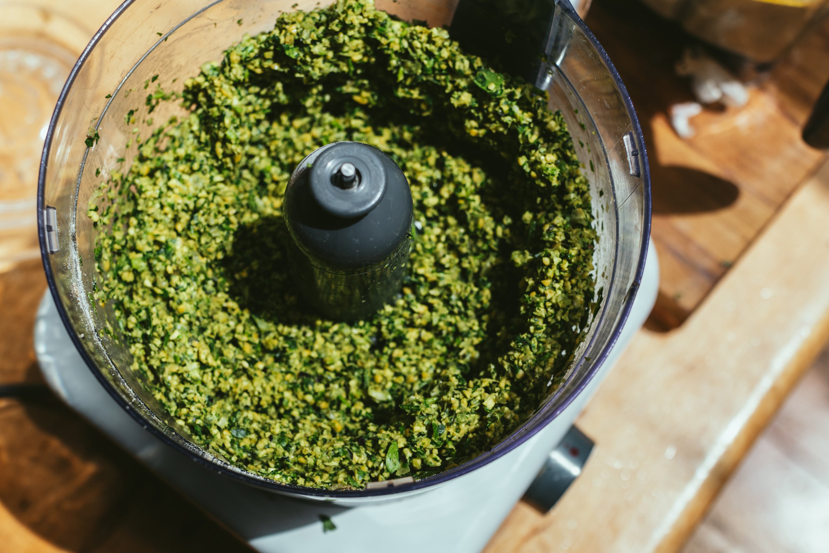 Transfer the falafel mixture to a bowl and add the chickpea flour and baking soda. Combine and cover. Refrigerate the mixture for an hour.