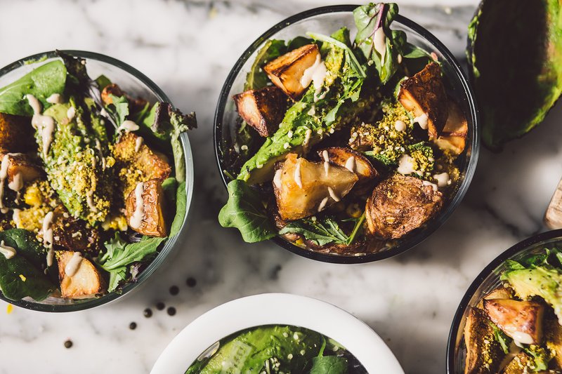 To assemble, divide the millet, salad leaves, sprouts, miso eggplant and the reserved miso mixture between bowls. Top with avocado, sesame seeds and a dollop of tahini dressing