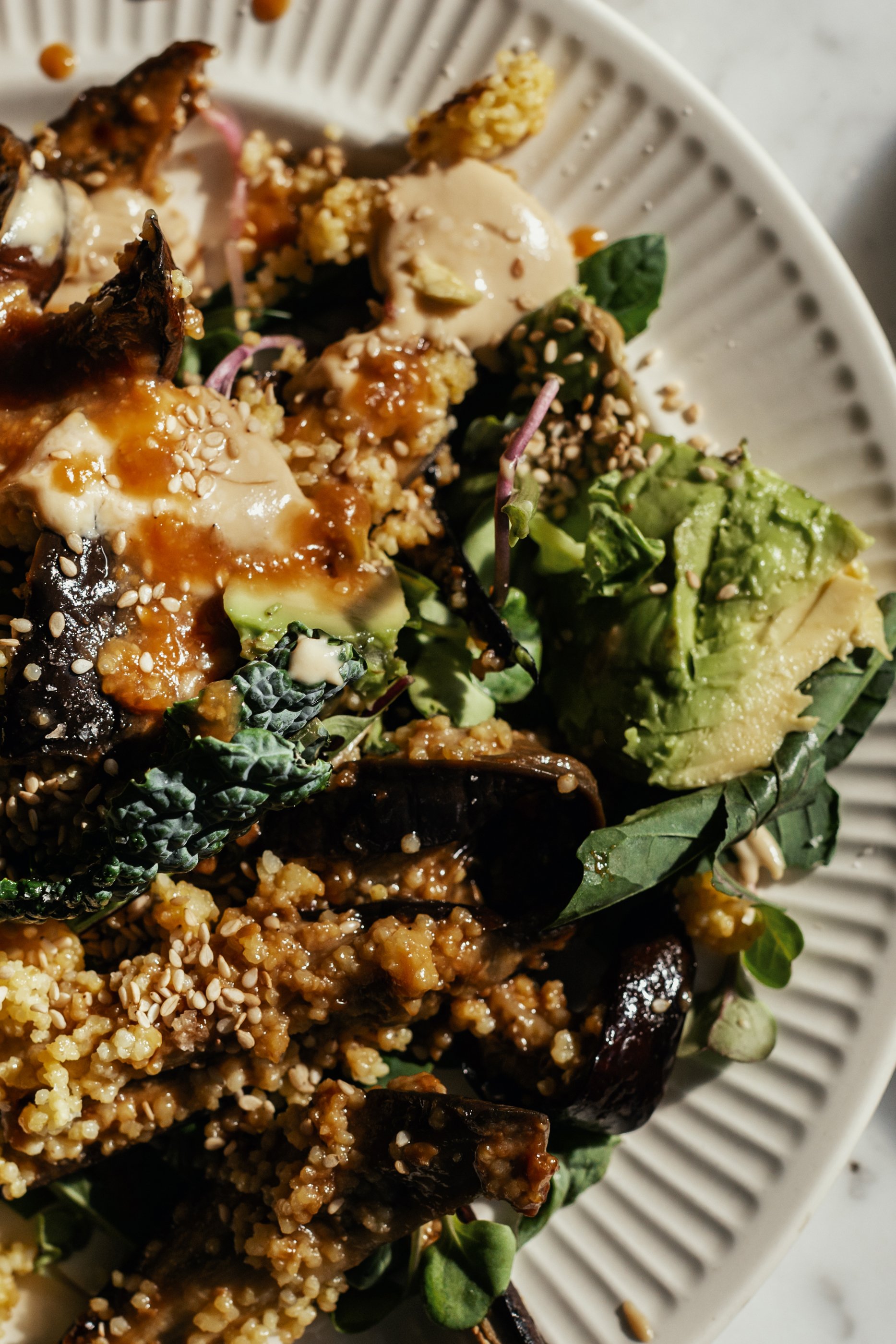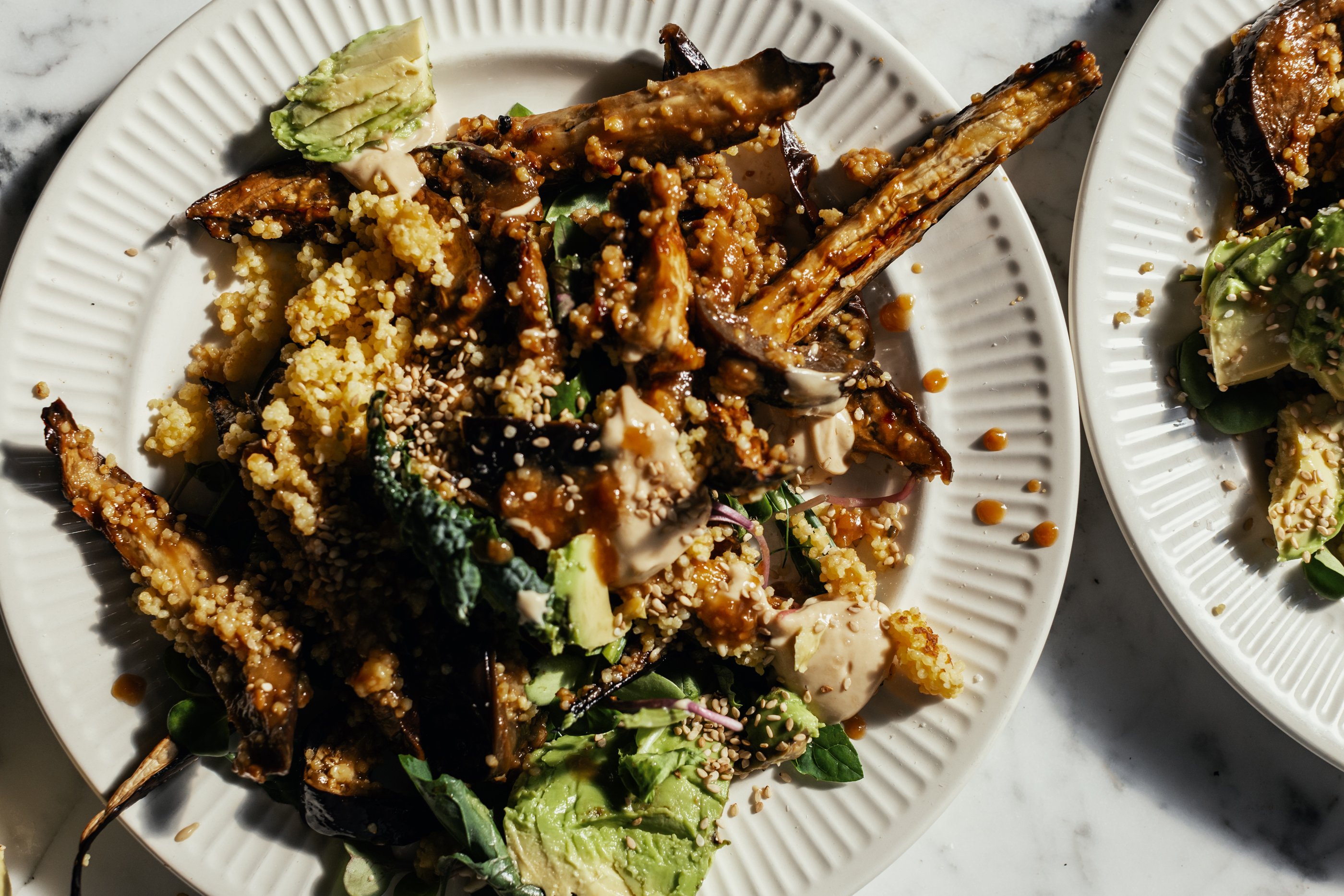This millet salad with miso eggplant is super easy to prepare, grounding, and nutrient-dense, combining millet with delicious umami miso-infused eggplant, creating a rewarding dish. We layered the ensemble here with our classic tahini dressing for additional earthy garlic flavours. The joy of this recipe is how chic it sounds and looks and still how simple it is, with only three primary ingredients and a marinade. I also love that you could create a sophisticated and nutritive food experience for potential guests in no time.