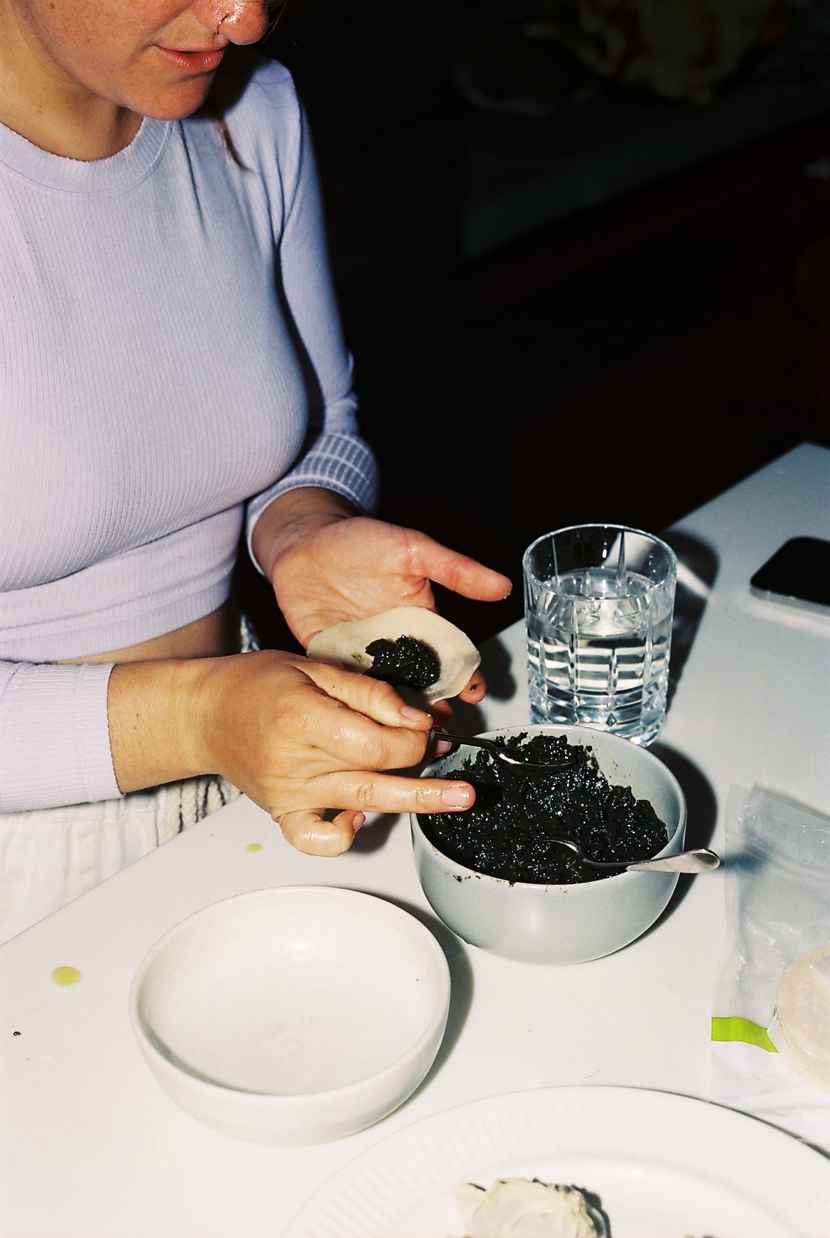 Set up your dumpling assembly line with a bowl of filling, wrappers, and a small bowl of water. Using a teaspoon, scoop a mound of filling and place it in the centre of one wrapper. To fold, use your fingertip to dampen the edges with water. Bring together the sides over the filling to enclose it in a half-moon. Pinch the centre together, then press the edges together to seal, pleating decoratively if you’d like. Repeat with the remaining filling and wrappers.