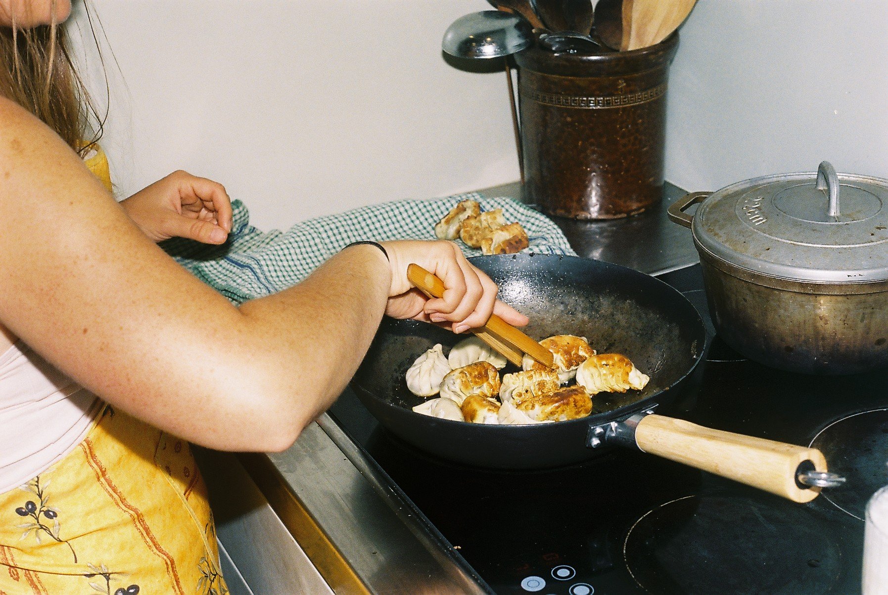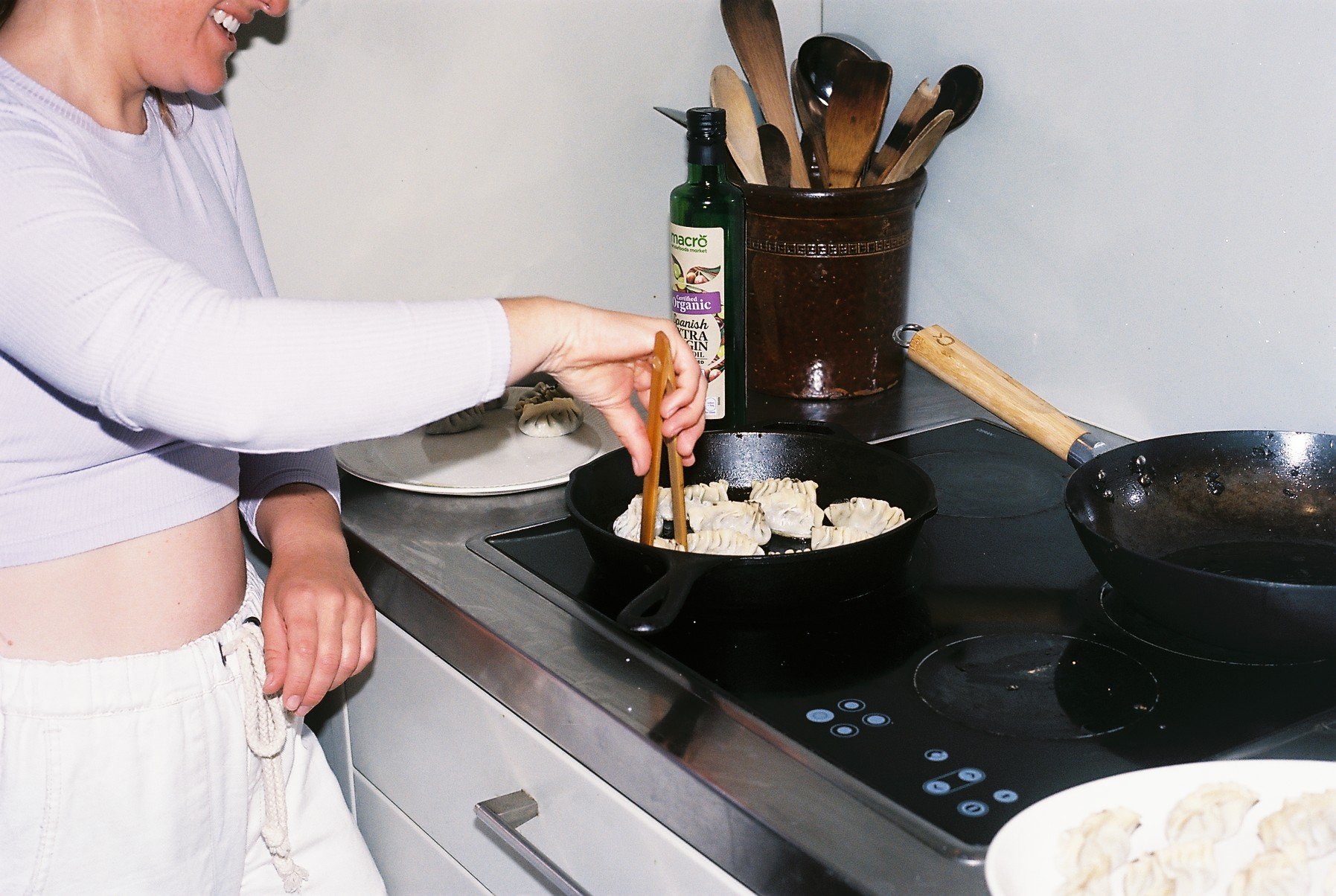 You can cook as many or as few dumplings at a time as you’d like. Choose your pan size accordingly: A 20 cm or 8-inch skillet will fit 8 to 10. When ready to cook, cast-iron pan with a thin, even layer of oil.