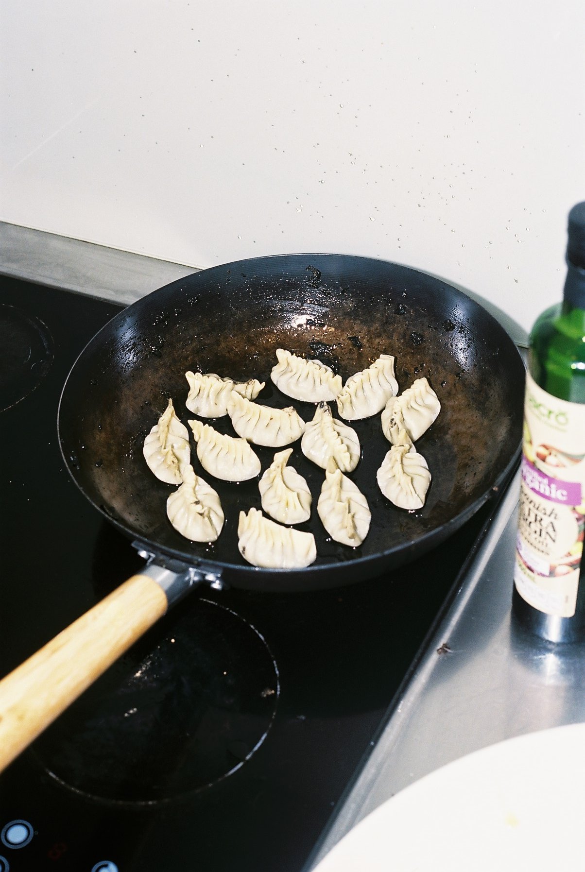 Set the pan over medium heat and warm the oil for 2 minutes. Adding one dumpling at a time but working quickly, add as many dumplings as will comfortably fit in a single layer in the pan (don’t crowd them, or they won’t cook evenly).