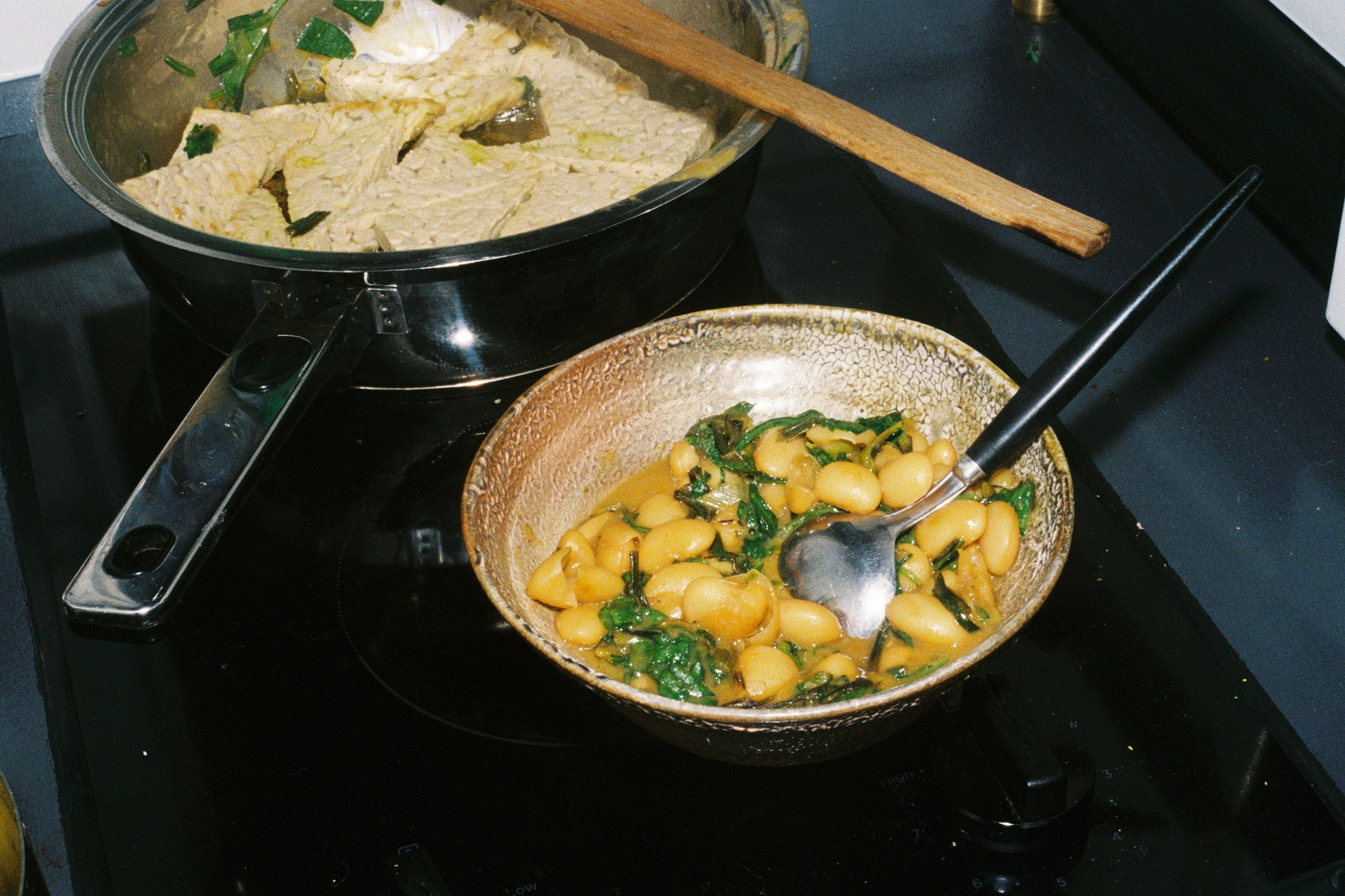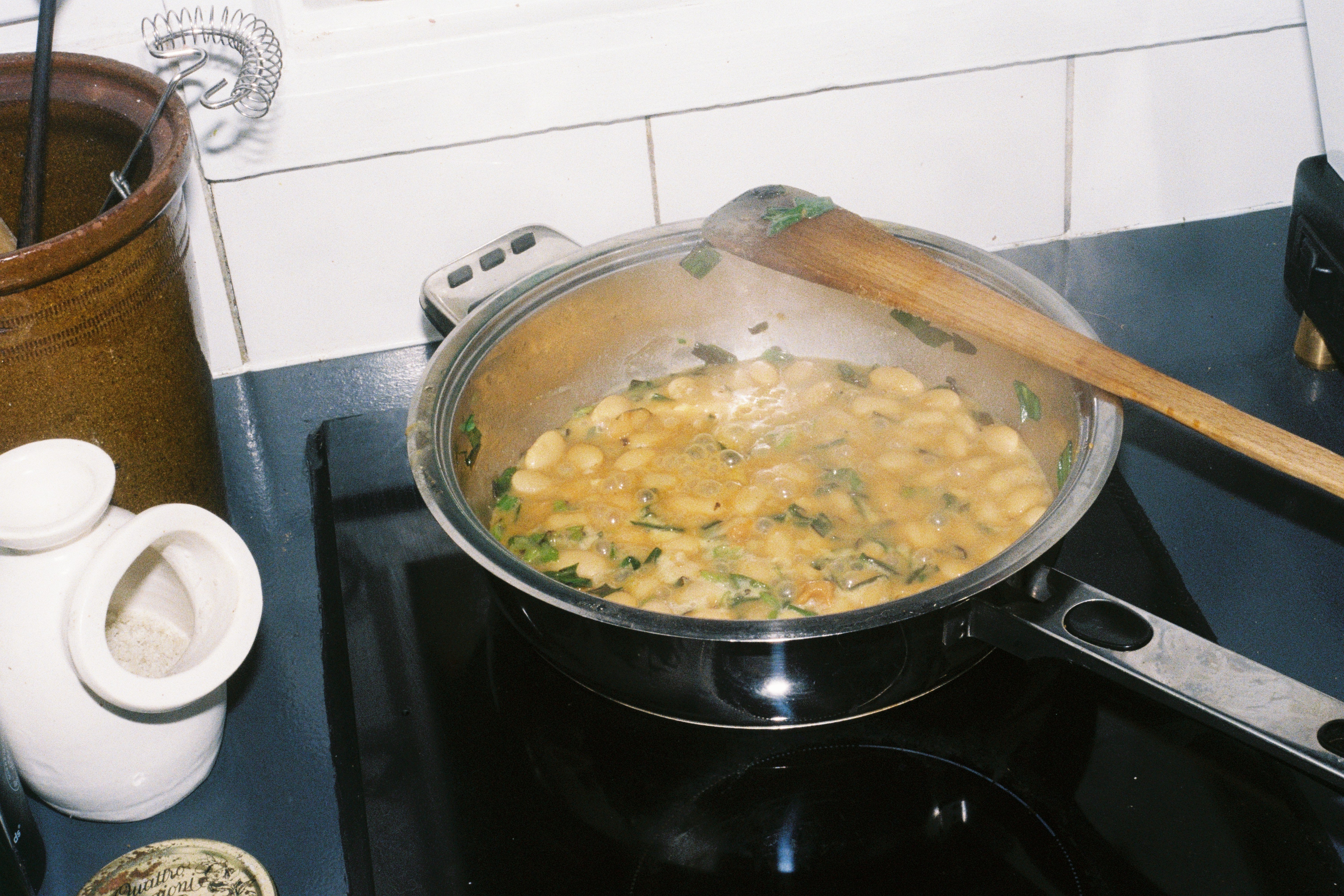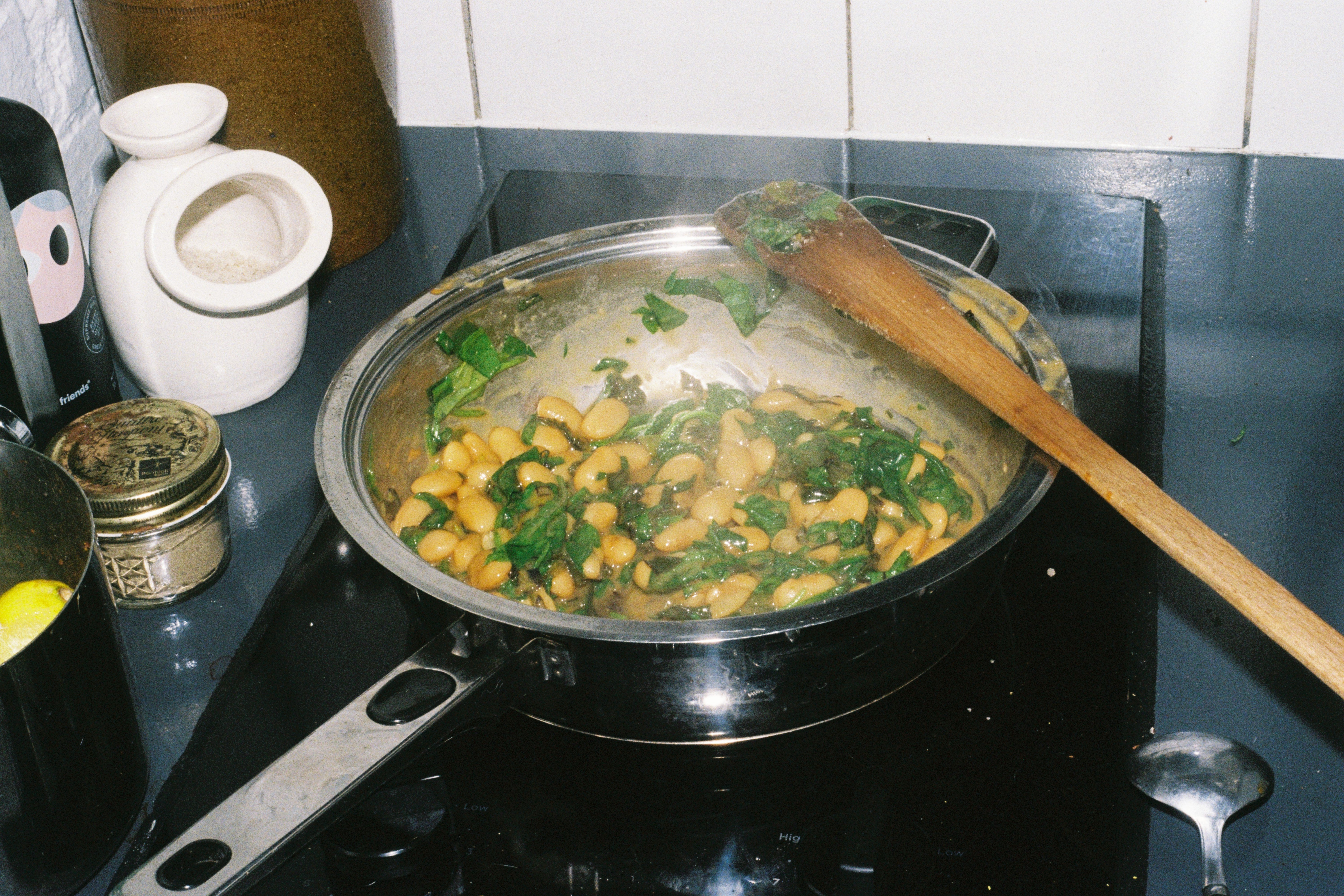 Bring to a simmer, reduce the heat and when you achieve your desired beans to liquid ratio. Stir through the spinach.