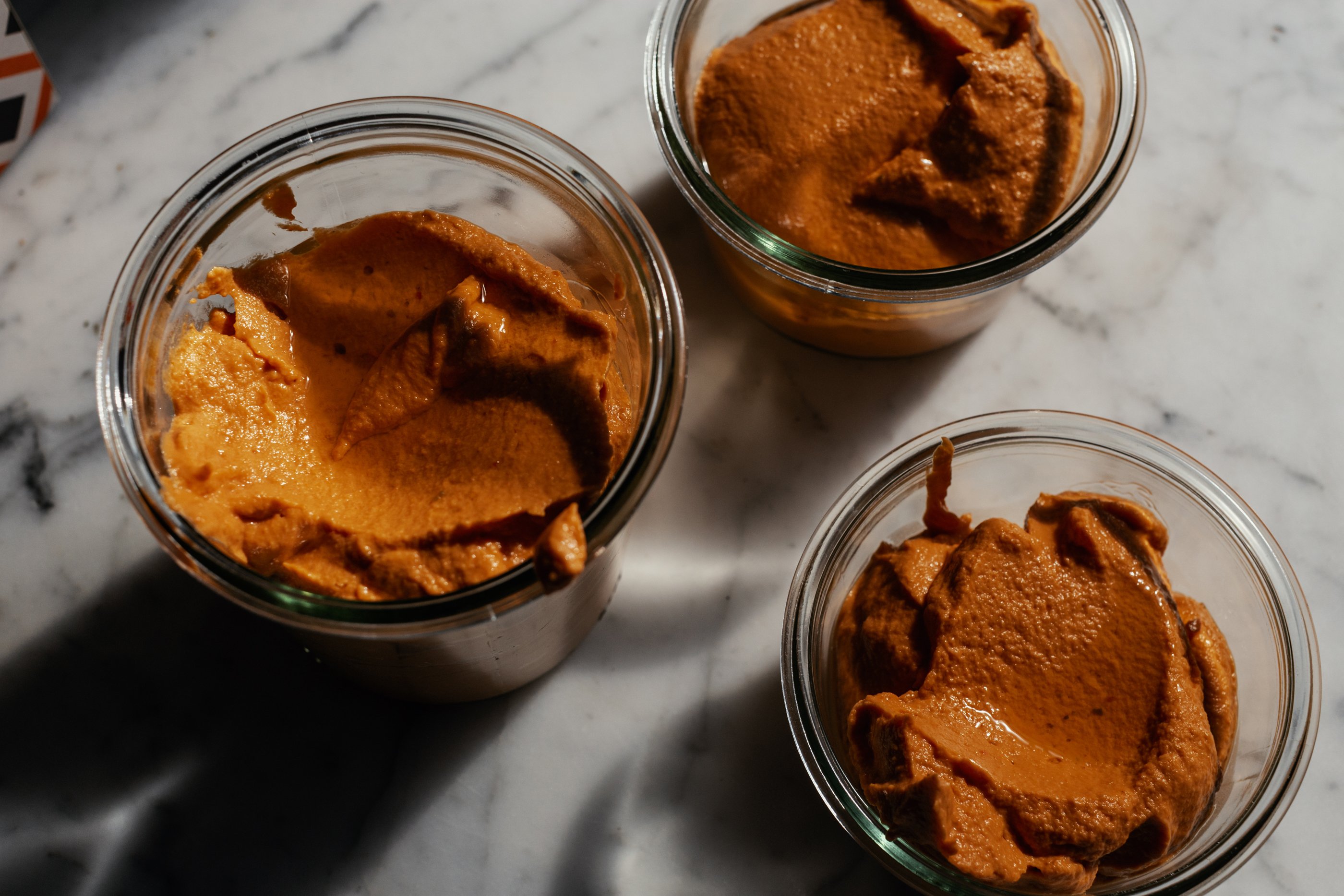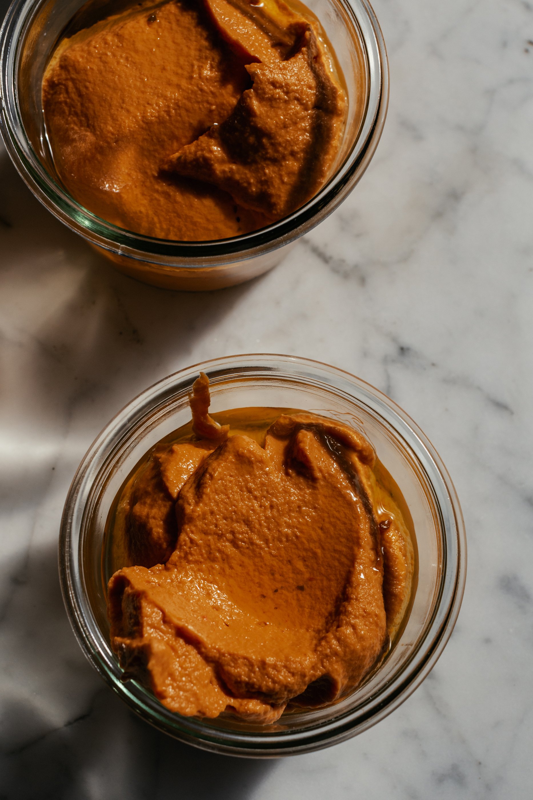 Add the garlic and lemon liquid to your blender with the tahini and pulse to combine. Add the roasted red pepper, oil and sun-dried tomatoes and blend.