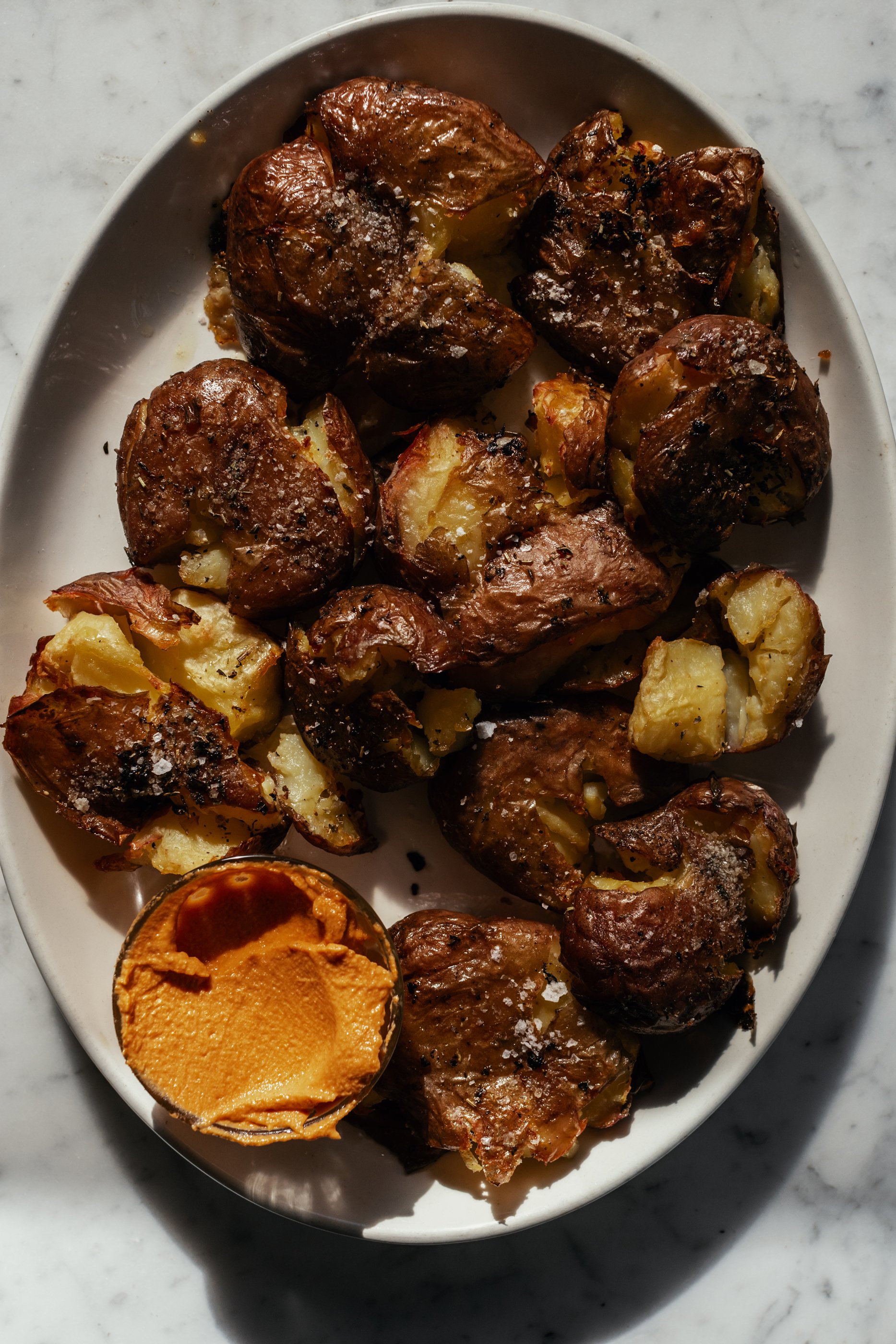 Blend the garlic, lemon juice, and 1 teaspoon of salt in a food processor or blender until foamy. Let sit. The garlic will mellow out—strain, removing as much liquid as possible. You’ll use this. Set aside the remaining solid garlic, you can use this for cooking.