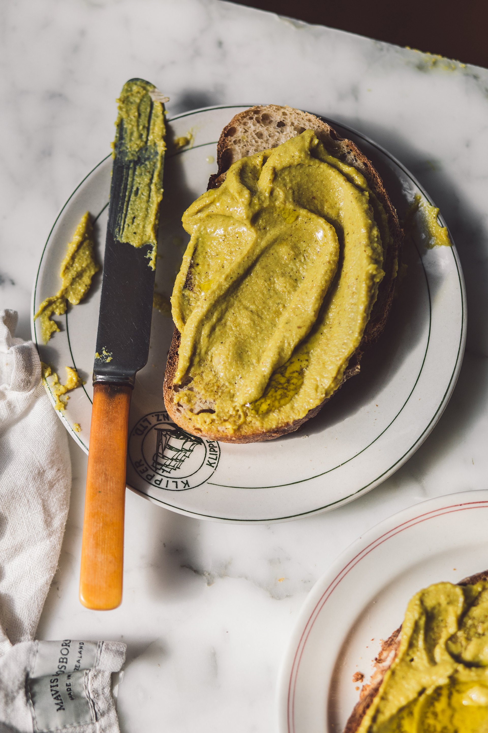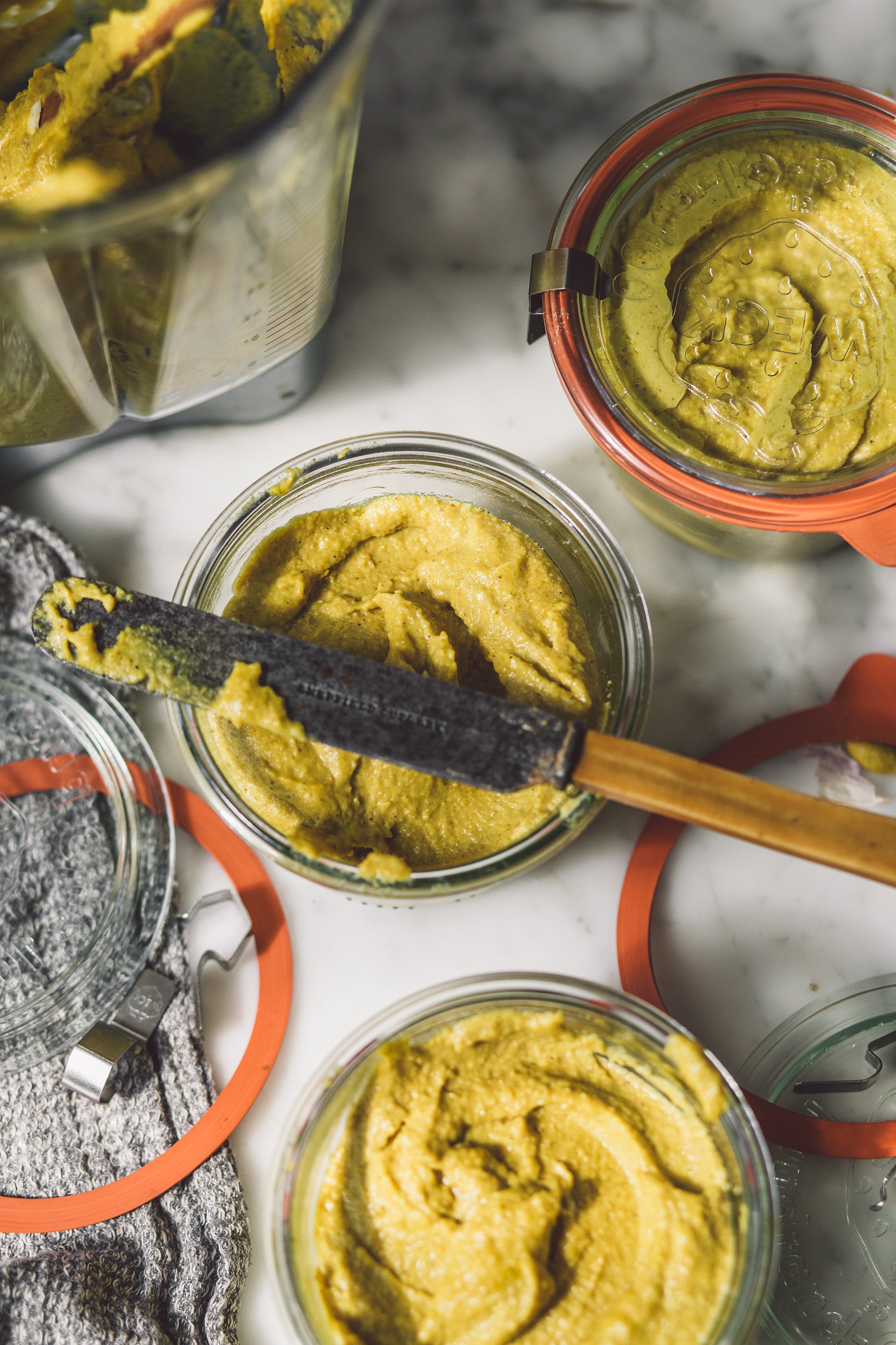 Hummus is a staple for my partner and I, so I always have a few jars in the fridge, it is something I prepare weekly from scratch which has not only saved me money but reduced the amount of recycling I put out! This turmeric hummus is made from split peas, and if you're a purist you probably would not think this was acceptable as hummus — but make it, it is very good. Grounding and warming, split peas are deeply satisfying to the system, high in plant protein and fibre offering a wide variety of minerals from the depths of the soil in which they grow.