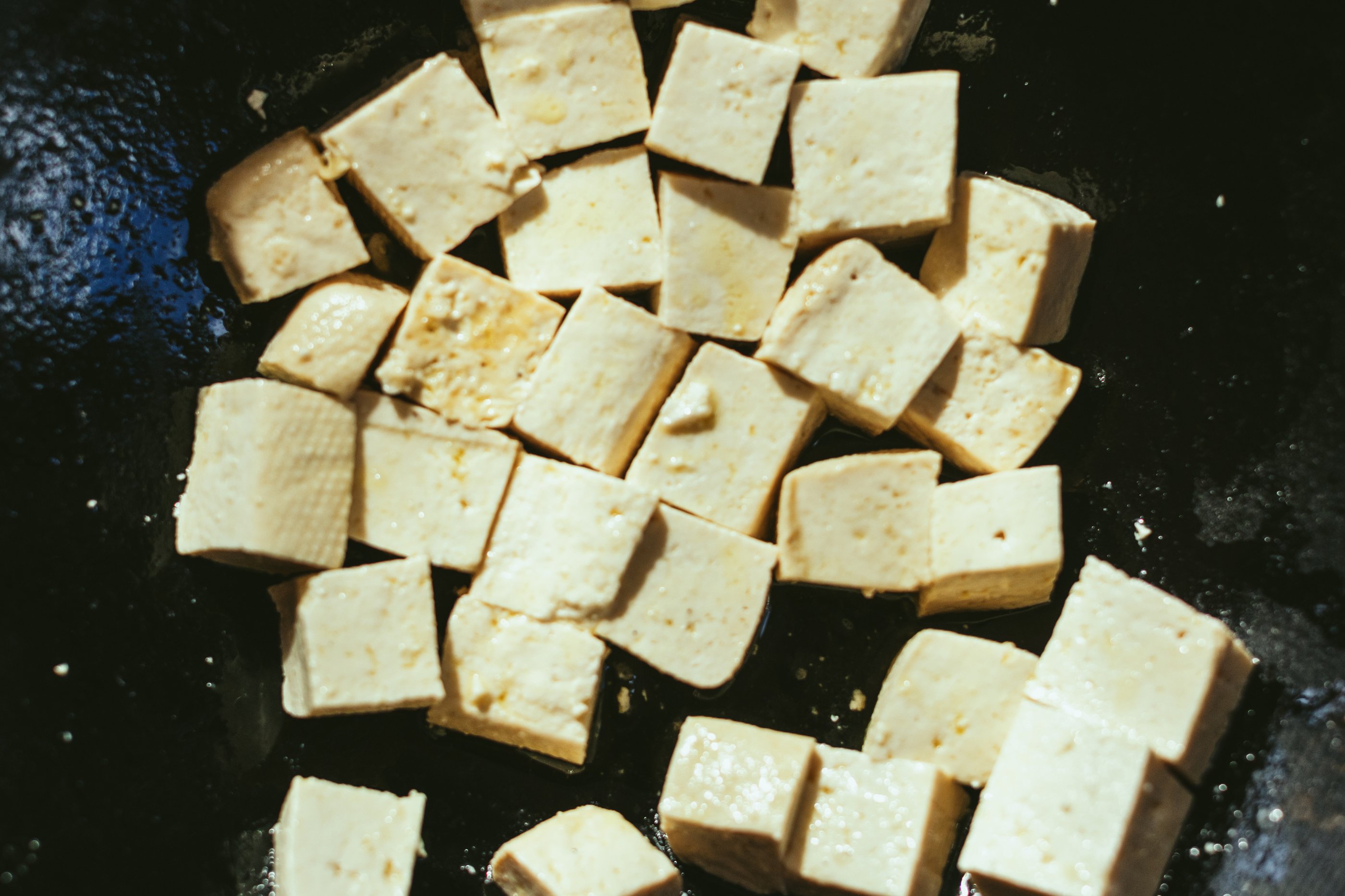 Transfer the cut tofu in a pan (we prefer cast-iron) and cook for 5 minutes over medium-low heat. Toss regularly to avoid the tofu sticking to the pan, and lower the heat if that happens. Feel free to add a few pinch of salt to fasten the process.