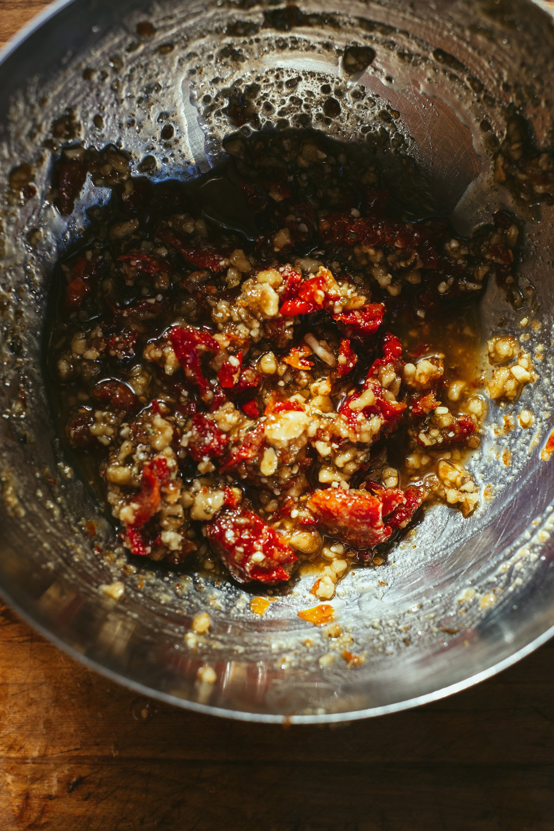 Transfer the walnut mixture to a bowl and stir through the sundried tomatoes and olive oil. Season with salt to taste.